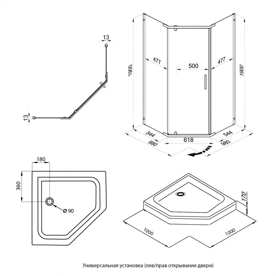 Душевое ограждение (без поддона) Дека-Голд, 100х100, пятиугольник