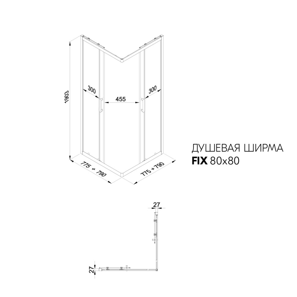 Душевое ограждение (без поддона) Фикс-Блэк 80*80, квадрат