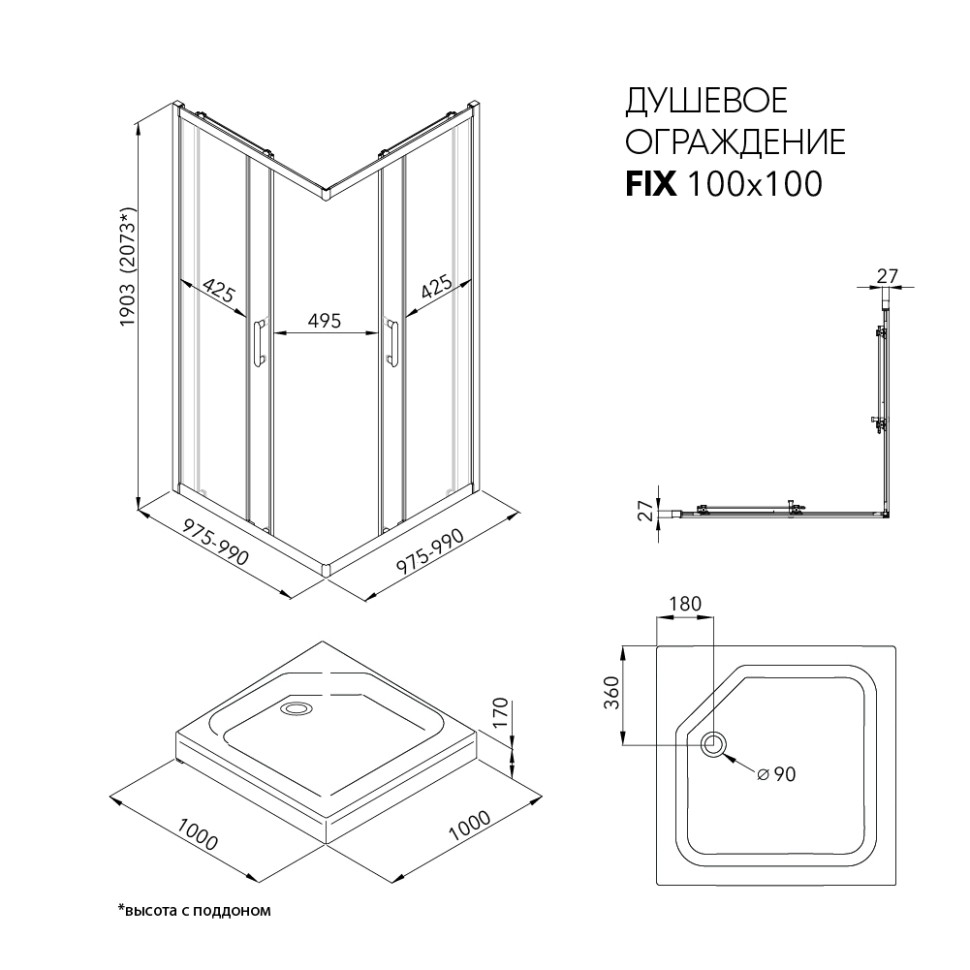 Душевое ограждение Фикс-Хром 100*100, квадрат