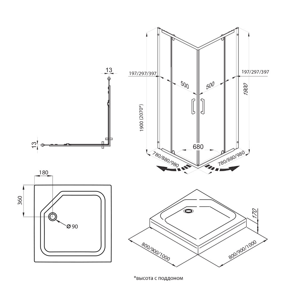 Душевое ограждение Каппа-Хром 90х90, квадрат, низкий поддон
