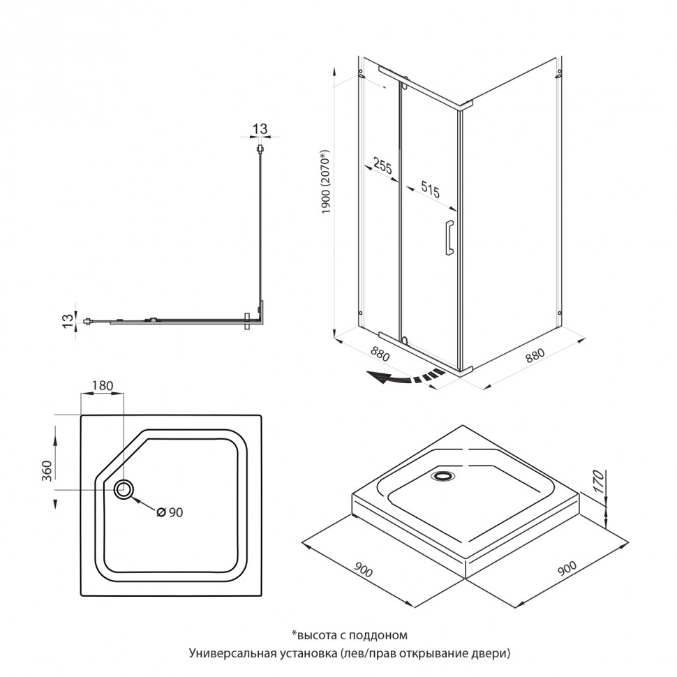 Душевое ограждение Терра-Графит, 90х90, квадрат низкий поддон