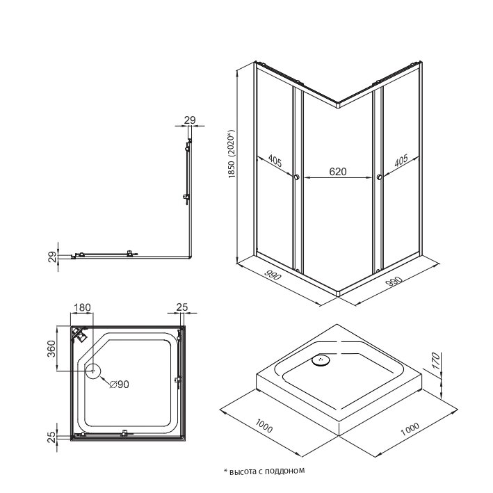 Душевое ограждение Вента-Хром 100х100, квадрат, низкий поддон