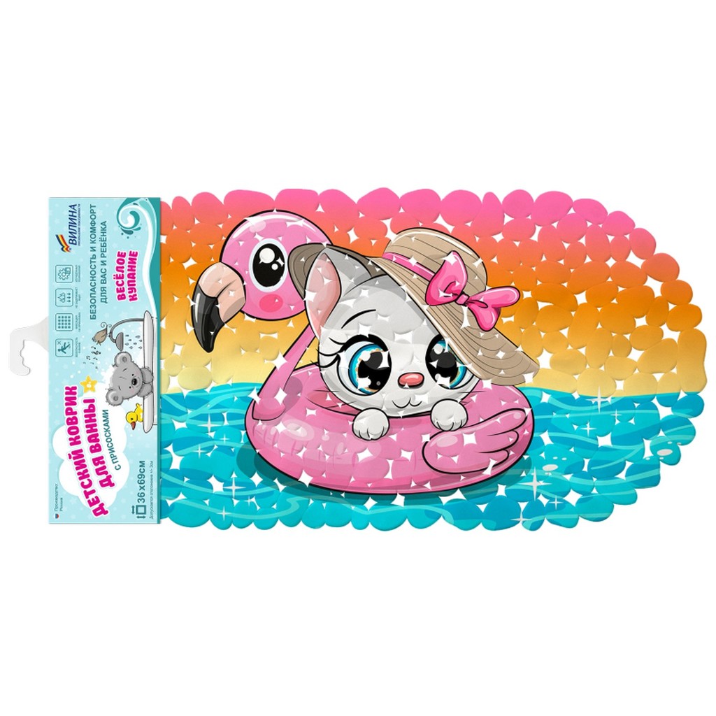 Детская коллекция ковриков с оригинальным ярким дизайном придаст купанию особое радостное настроение. Яркость и насыщенность красок достигается с помощью особо стойких, но при это полностью безопасных красителей. Коврики изготовлены из литого ПВХ, их поверхность покрыта специальной прозрачной защитной плёнкой. Она не искажает качество рисунка, но несет дополнительную защиту кожи малыша от возможной аллергической реакции, а также защищает сам рисунок от выцветания, стирания, повреждения. Присоски обеспечивают хорошее сцепление с поверхностью ванны, коврик не сдвигается и не собирается в складки. Антискользящая поверхность надежно защищает от падения и травмирования во время принятия ванны.