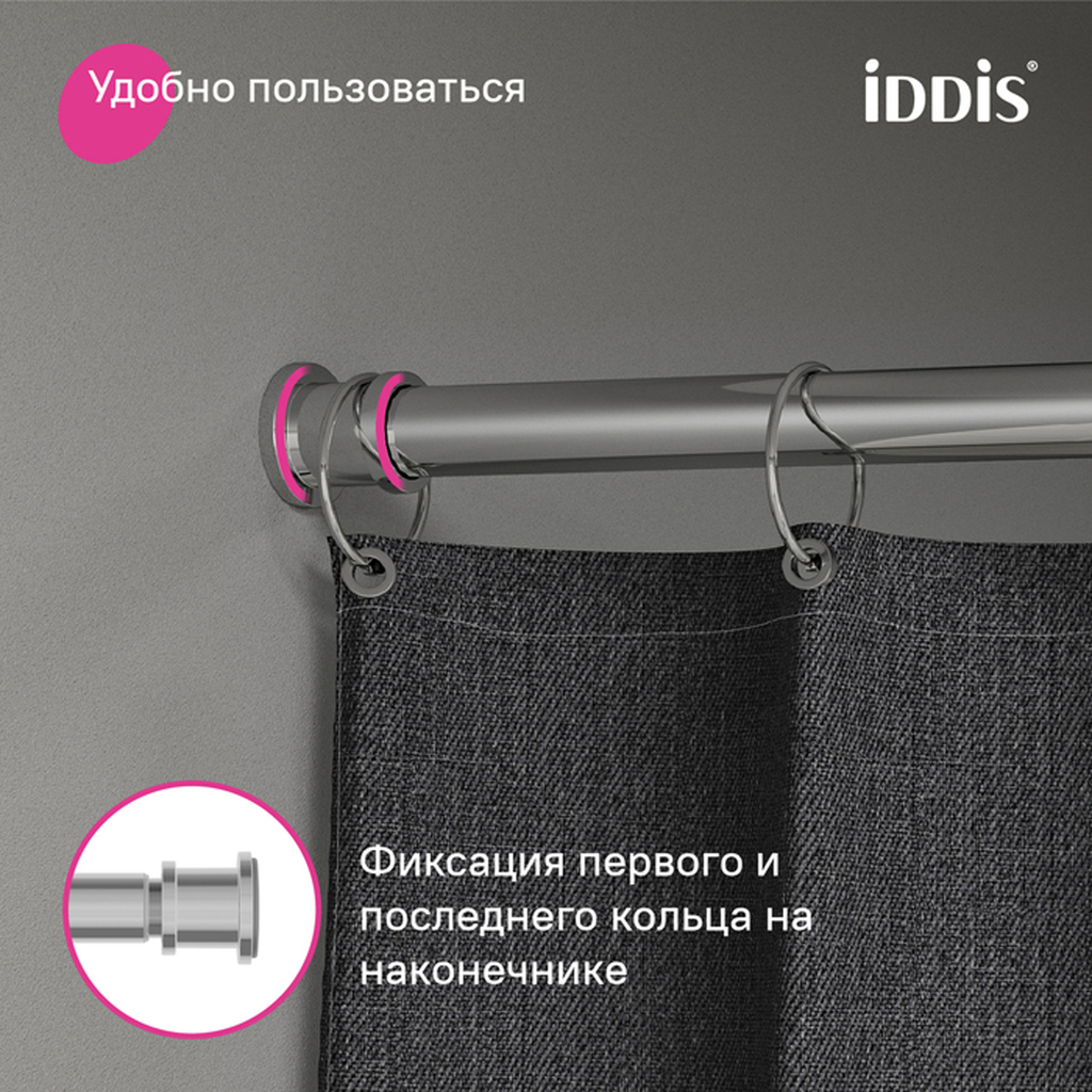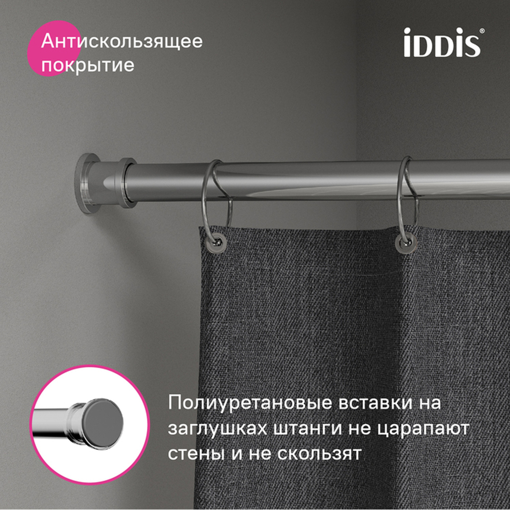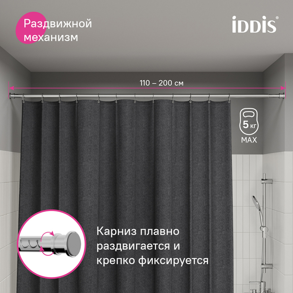 Карниз для шторы в ванную комнату регулируется по длине от 110 до 200 см благодаря телескопической конструкции. Прост в установке, не требует сверления и использования дополнительных инструментов. Карниз плавно раздвигается и крепко фиксируется враспор, длина регулируется путем его закручивания в ту или иную сторону. Изготовлен из легкого и прочного алюминия. Имеет пластиковые наконечники, за счет которых не поцарапает стены в ванной. Гарантия на карнизы IDDIS® – 1 год.Сертификаты, декларации и паспорта товаров TIM