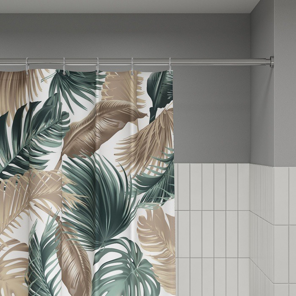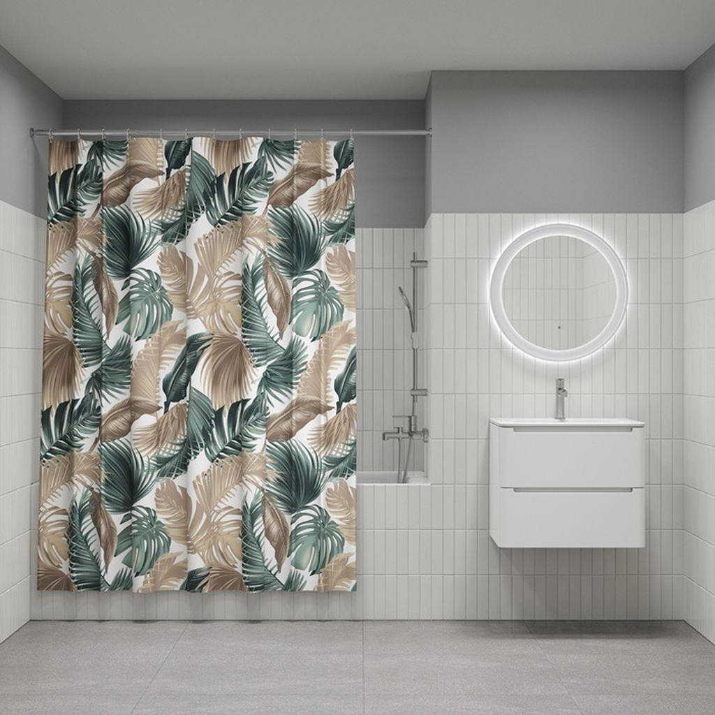 Текстильная штора для ванной комнаты в современном стиле изготовлена из 100%-го полиэстера с водоотталкивающей пропиткой.Штора поставляется в комплекте с кольцами (12шт).