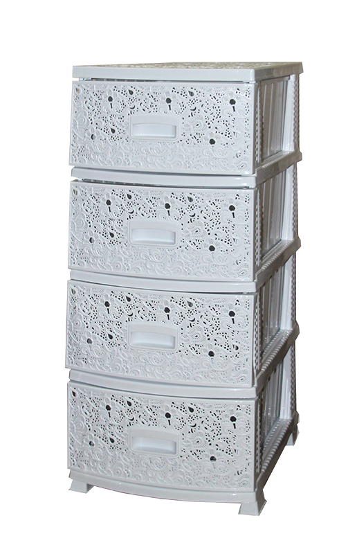 Комод из пищевого пластика с четырьмя выдвижными ящиками предназначен для хранения вещей и продуктов питания. Он гармонично впишется в интерьер любой комнаты. Легкий и вместительный комод поможет обеспечить порядок в доме. Узор на передних панелях придаст индивидуальность и подарит настроение.Не рекомендуется размещение пластикового комода вблизи батарей центрального отопления и электрических обогревателей.