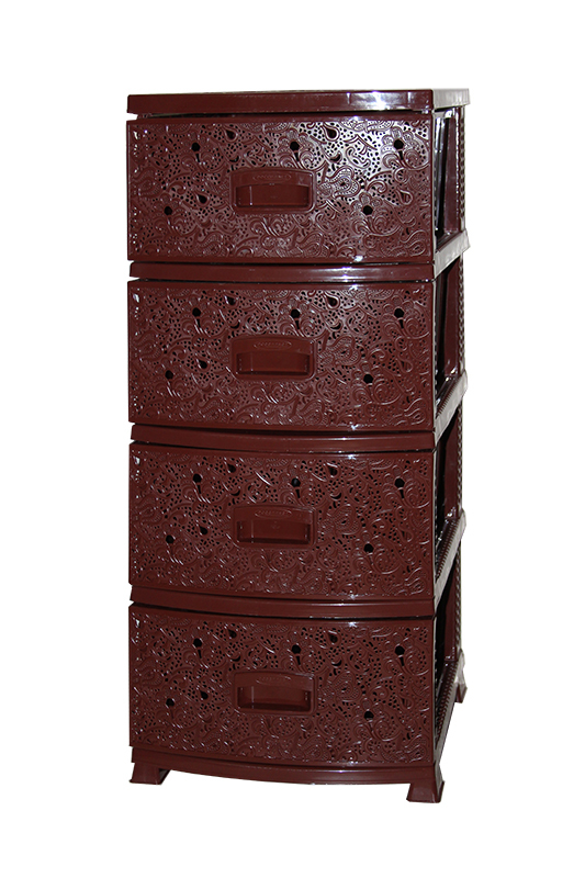 Комод из пищевого пластика с четырьмя выдвижными ящиками предназначен для хранения вещей и продуктов питания. Он гармонично впишется в интерьер любой комнаты. Легкий и вместительный комод поможет обеспечить порядок в доме. Узор на передних панелях придаст индивидуальность и подарит настроение.Не рекомендуется размещение пластикового комода вблизи батарей центрального отопления и электрических обогревателей.