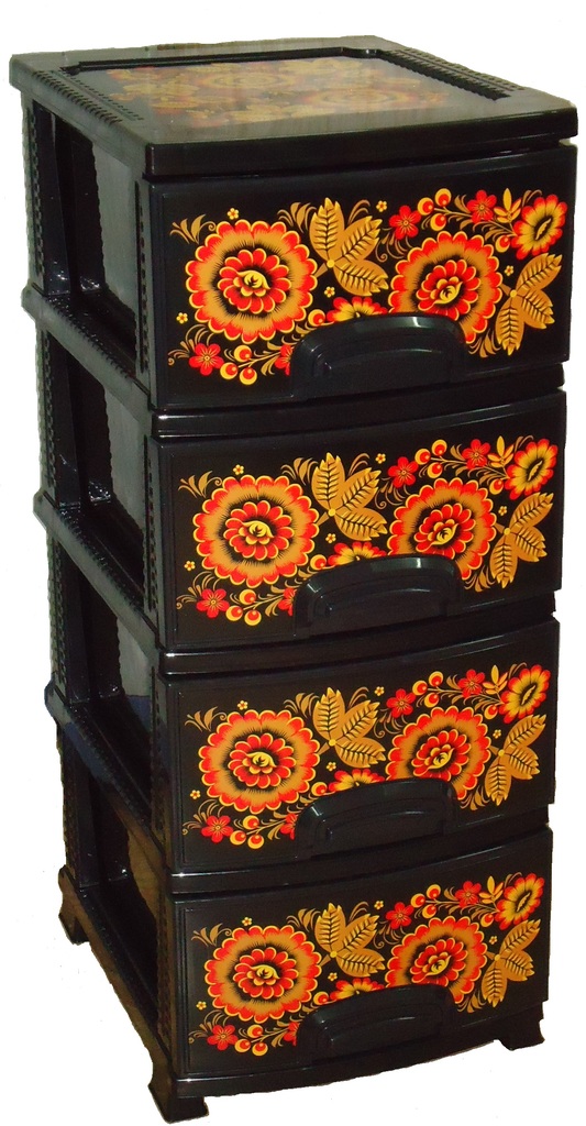Комод из пищевого пластика с четырьмя выдвижными ящиками предназначен для хранения вещей и продуктов питания. Он гармонично впишется в интерьер любой комнаты. Легкий и вместительный комод поможет обеспечить порядок в доме. Узор на передних панелях придаст индивидуальность и подарит настроение.Не рекомендуется размещение пластикового комода вблизи батарей центрального отопления и электрических обогревателей.