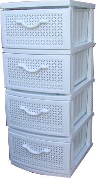 Комод из пищевого пластика с четырьмя выдвижными ящиками предназначен для хранения вещей и продуктов питания. Он гармонично впишется в интерьер любой комнаты. Легкий и вместительный комод поможет обеспечить порядок в доме. Узор на передних панелях придаст индивидуальность и подарит настроение.Не рекомендуется размещение пластикового комода вблизи батарей центрального отопления и электрических обогревателей.
