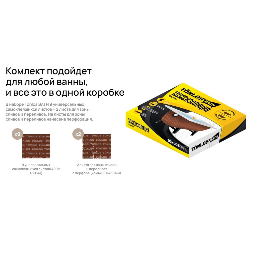 Комплекта TONLOS BATH хватит для стандартной стальной ванны длиной до 1800 мм или акриловой ванны с аналогичным размером чаши. В комплекте есть листы с перфорацией для зон слива и перелива. Можно быстро и точно вырезать отверстие для отводящих патрубков.