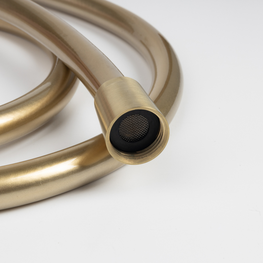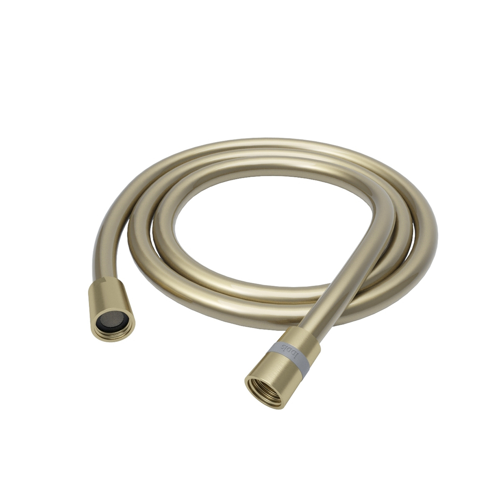 Стильный гладкий душевой шланг в оттенке матового золота надежен и легко выдерживает активную ежедневную эксплуатацию. Универсальное соединение позволяет использовать с любой лейкой в тон. Стандартная длина 1,5 м.• Из гладкого ПВХ, не поцарапает деликатную поверхность акриловых ванн и поддонов.