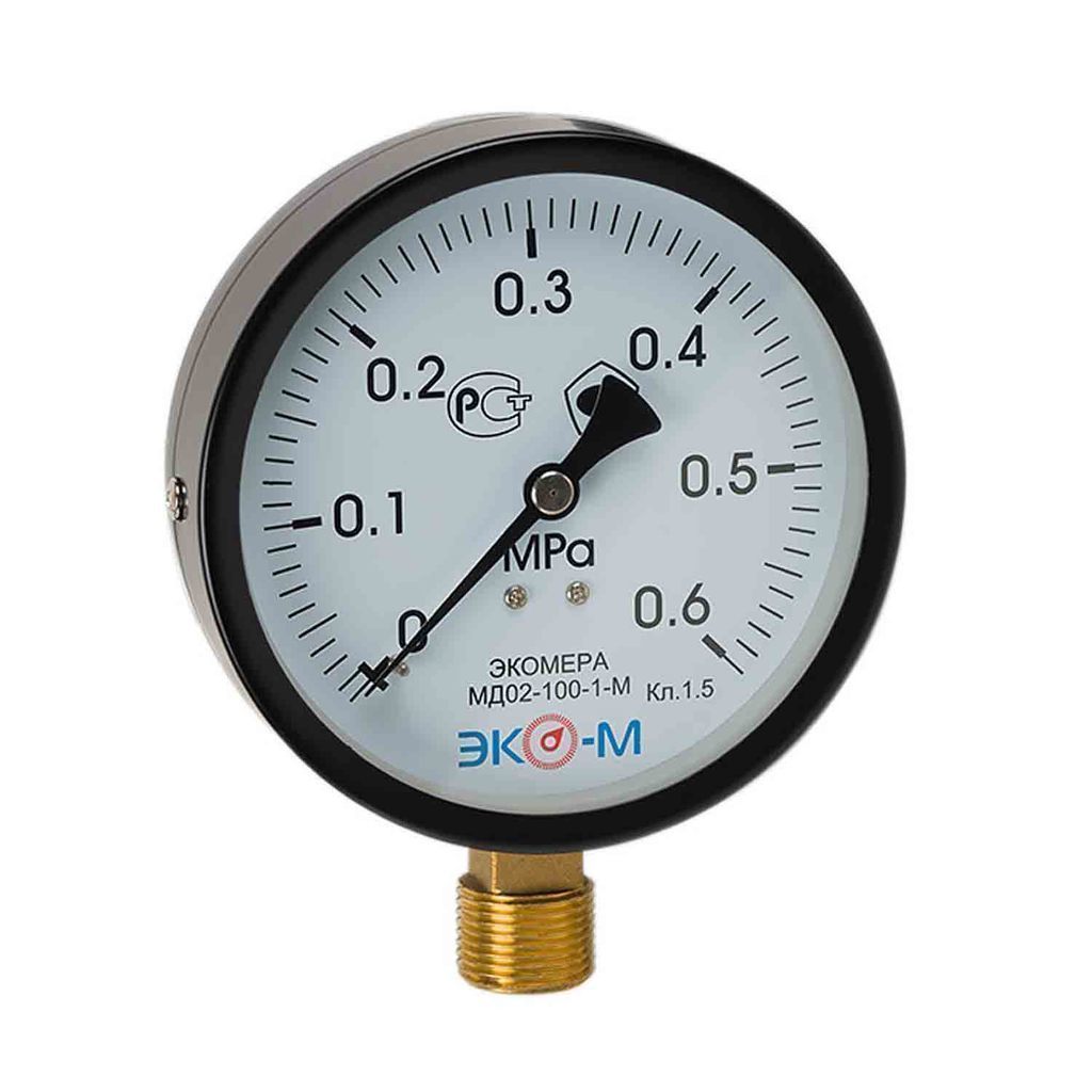 Манометр общетехнический ЭКОМЕРА МД02 для измерения давления газообразных и жидких, не сильновязких и кристаллизующихся сред, не агрессивных по отношению к медным сплавам (вода, пар, газ).Межповерочный интервал: 2 года.