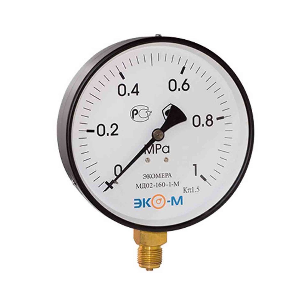 Манометр общетехнический ЭКОМЕРА МД02 для измерения давления газообразных и жидких, не сильновязких и кристаллизующихся сред, не агрессивных по отношению к медным сплавам (вода, пар, газ).Межповерочный интервал: 2 года.