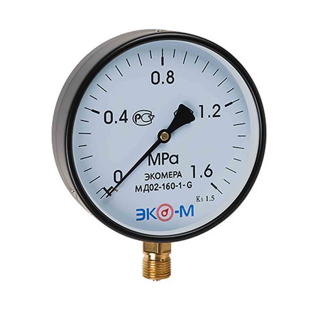 Манометр общетехнический ЭКОМЕРА МД02 для измерения давления газообразных и жидких, не сильновязких и кристаллизующихся сред, не агрессивных по отношению к медным сплавам (вода, пар, газ).Межповерочный интервал: 2 года.