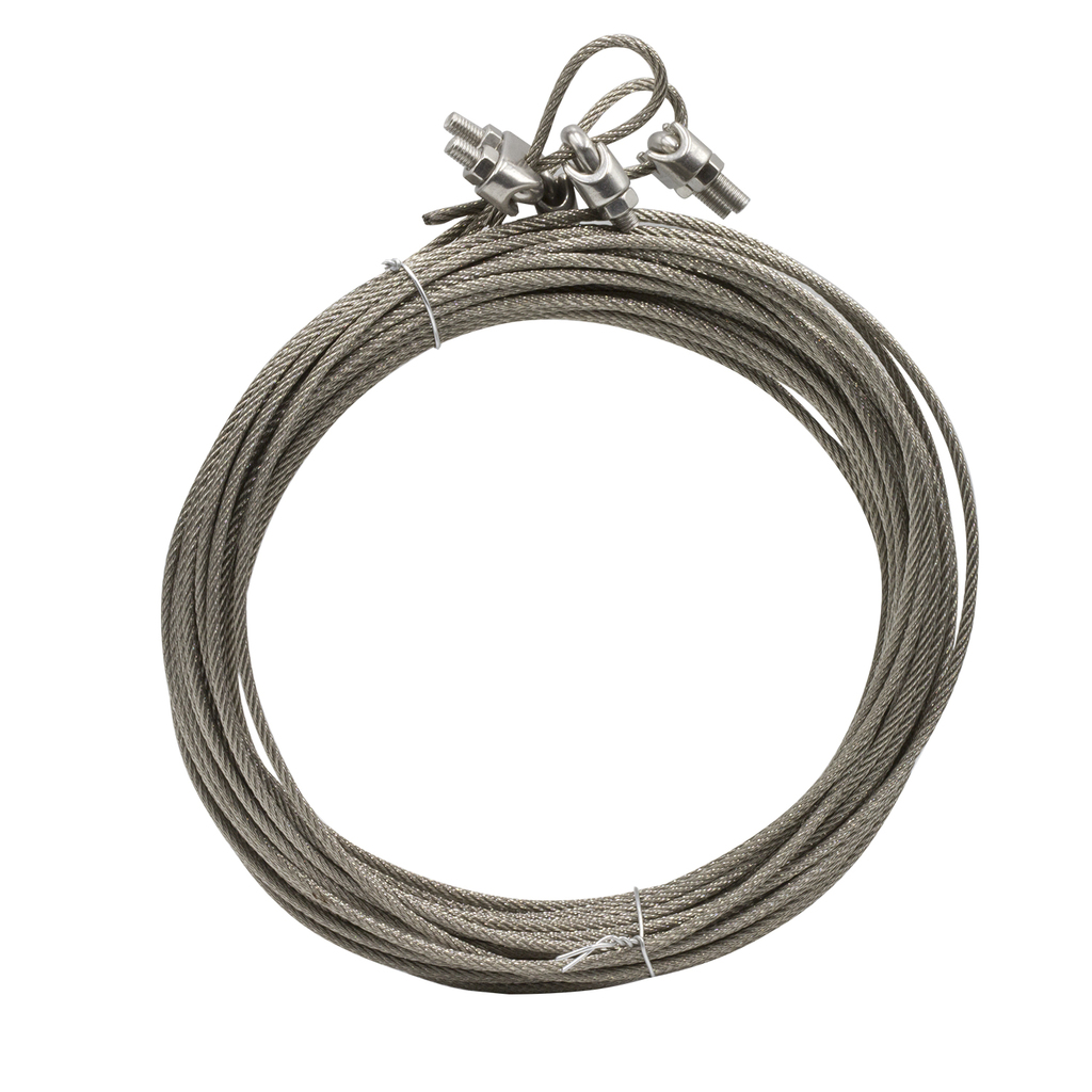 Комплект для подвешивания (крепления) погружного насоса служит для фиксации насоса к скважинному оголовку.Материал изготовления - нержавеющая сталь AISI 304 диаметром 3мм. Материал и диаметр троса подобраны оптимально, чтобы добиться надёжной фиксации насоса в скважине и не волноваться о его коррозии в следствии высокой влажности. Фиксировать трос на насосе и на оголовке необходимо с использование пары креплений.