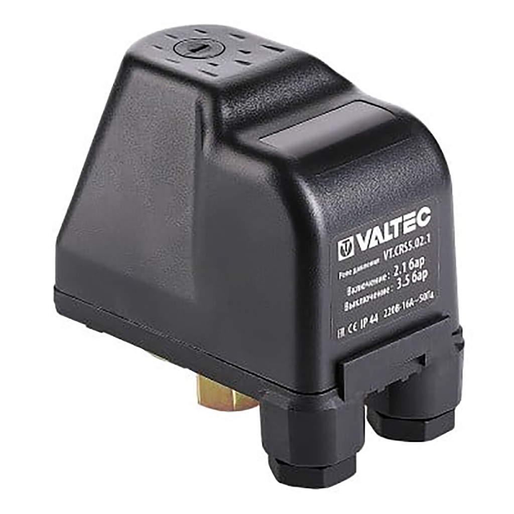 Реле давления VT.CRS5.02.1 – коммутационное устройство, предназначенное для автоматизации работы электронасосов водоснабжения. Реле включает и выключает насос при занижении и превышении заданных значений минимального и максимального давления. Заводская настройка – 2,1/3,5 бара. Пользователь может изменить ее по своему усмотрению в диапазоне 1,0–5,3 бара (минимальная разница значений – 1,0 бара).Материал контактов реле – серебряно-никелевый сплав, неокисляющийся во влажных условиях. Прибор допускается применять при влажности окружающей среды до 80 %. Класс защитной оболочки – IP44. Максимальная температура перекачиваемой среды – 40 °С. Резьба присоединительного патрубка – внутренняя, 1/4".