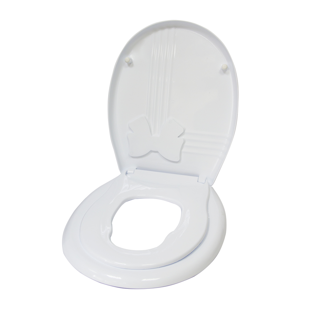 Удобное и практичное сиденье с привлекательным дизайном. Конструкция 2 в 1 включает в себя взрослое сиденье и детскую накладку.Бантик у белого сиденья представлен в ассортименте.