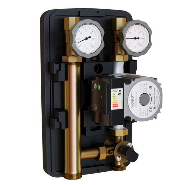 Группы быстрого монтажа VRT с трехходовым смесительным клапаном применяются для подачи теплоносителя в контур отопления с возможностью добавления охлажденного теплоносителя из обратноотводящей линии через смесительный клапан, таким образом регулируя температуру подачи.Насосная группа с трехходовым смесительным клапаном для систем отопления мощностью (до 50кВт) представляет собой готовый комплект арматуры, необходим для выполнения функции циркуляции теплоносителя в контуре отопления, с возможностью регулировки температуры теплоносителя.