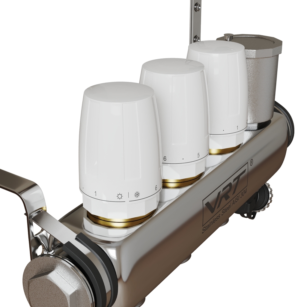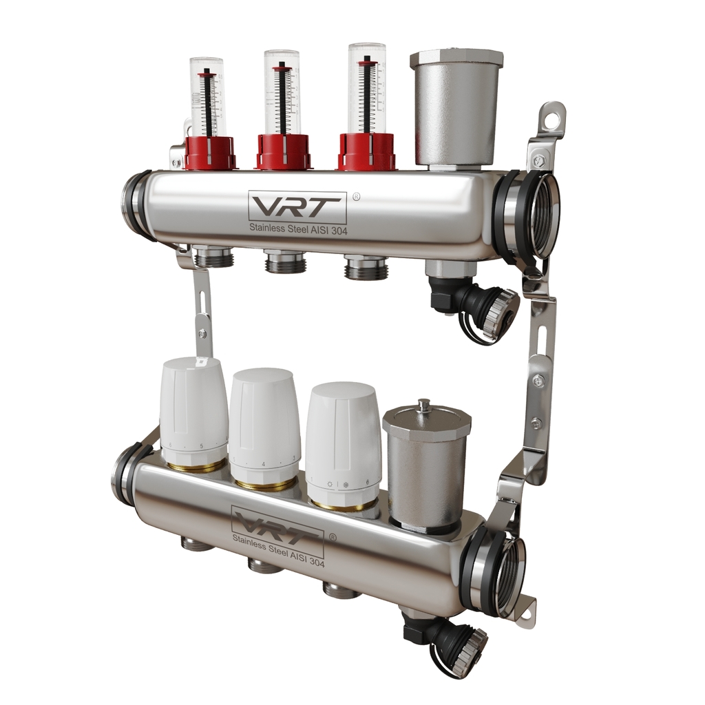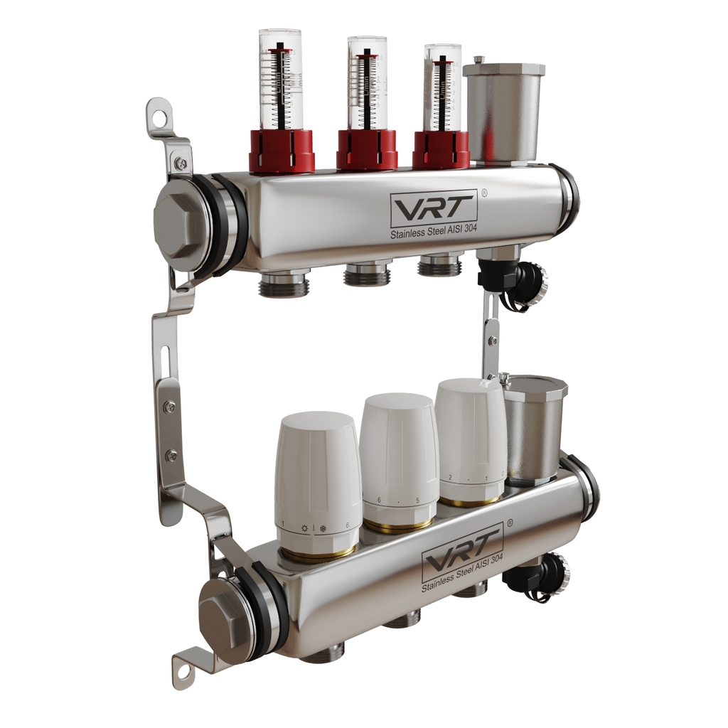 Коллекторные группы VRT являются распределительным изделием, посредством которого теплоноситель распределяется в контурах системы отопления, а также с ее помощью происходит балансировка контуров, перекрытие потоков, удаление воздуха из рабочей жидкости, слив теплоносителя.Преимущества коллекторных групп VRT: