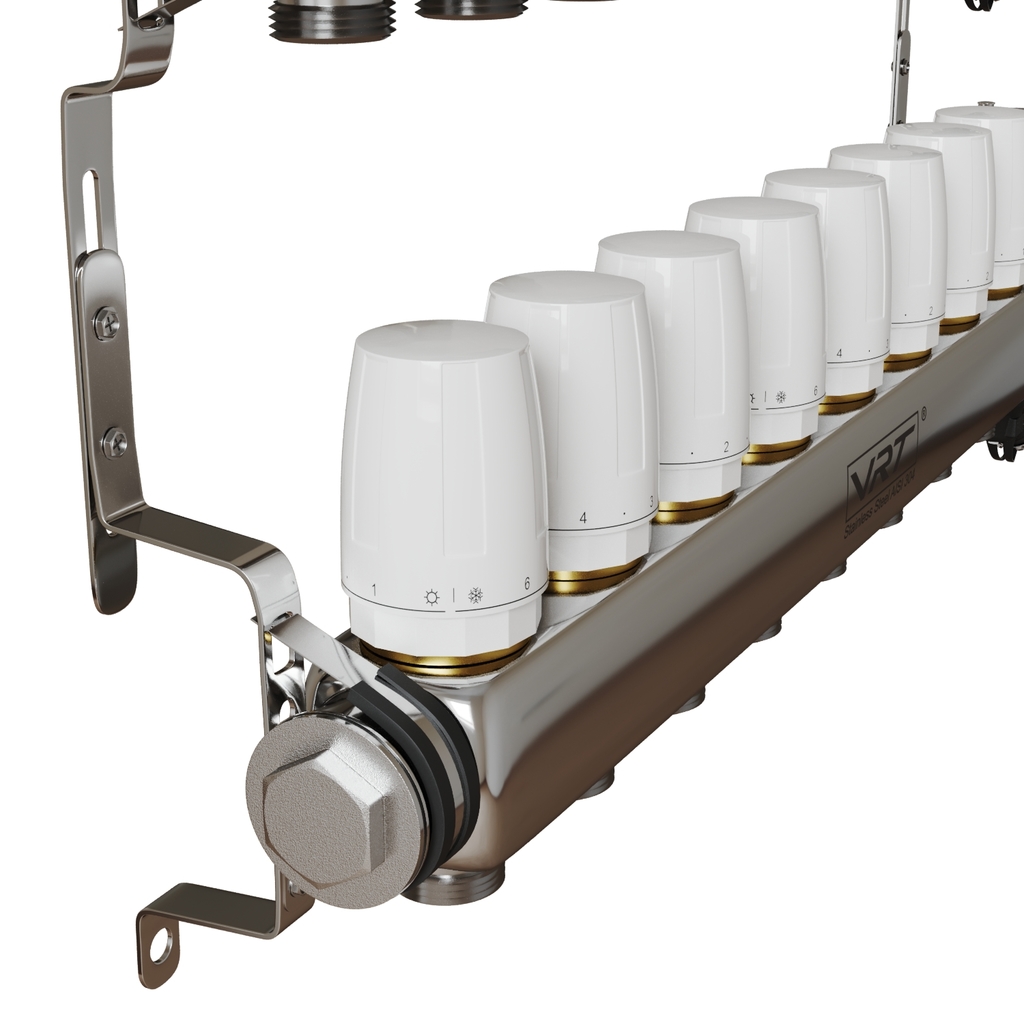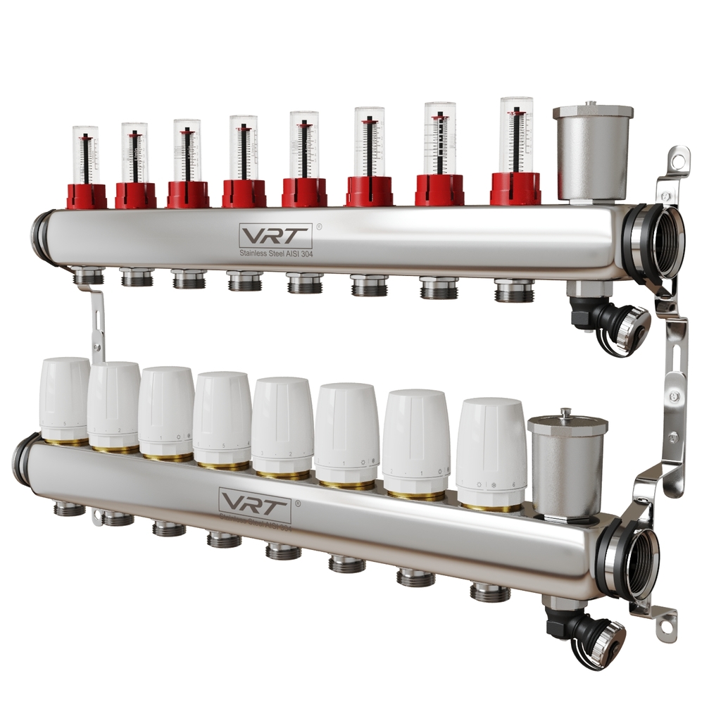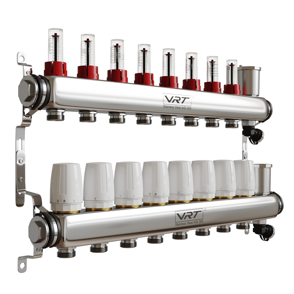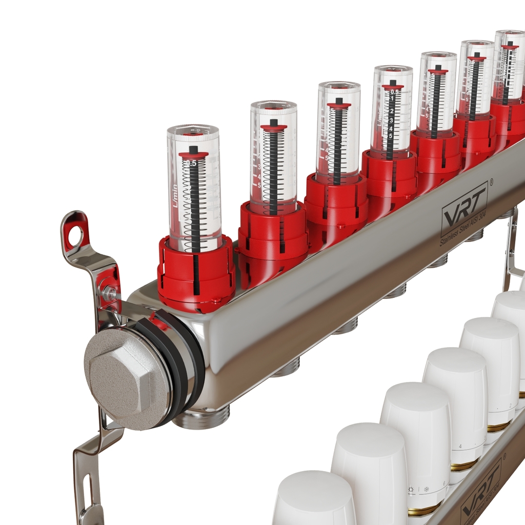 Коллекторные группы VRT являются распределительным изделием, посредством которого теплоноситель распределяется в контурах системы отопления, а также с ее помощью происходит балансировка контуров, перекрытие потоков, удаление воздуха из рабочей жидкости, слив теплоносителя.Преимущества коллекторных групп VRT: