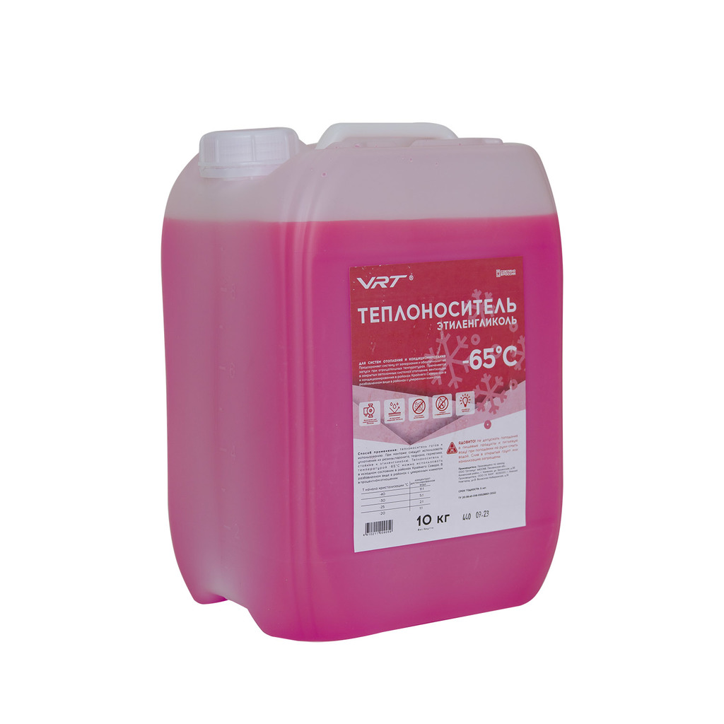 Теплоноситель VRT на основе этиленгликоля с температурой начала кристаллизации -65°С применяется в закрытых автономных системах отопления, вентиляции и кондиционирования в районах Крайнего Севера или в разбавленном виде в районах с умеренным климатом..Теплоноситель предохраняет систему от замерзания и обеспечивает ее запуск при отрицательных температурах.
