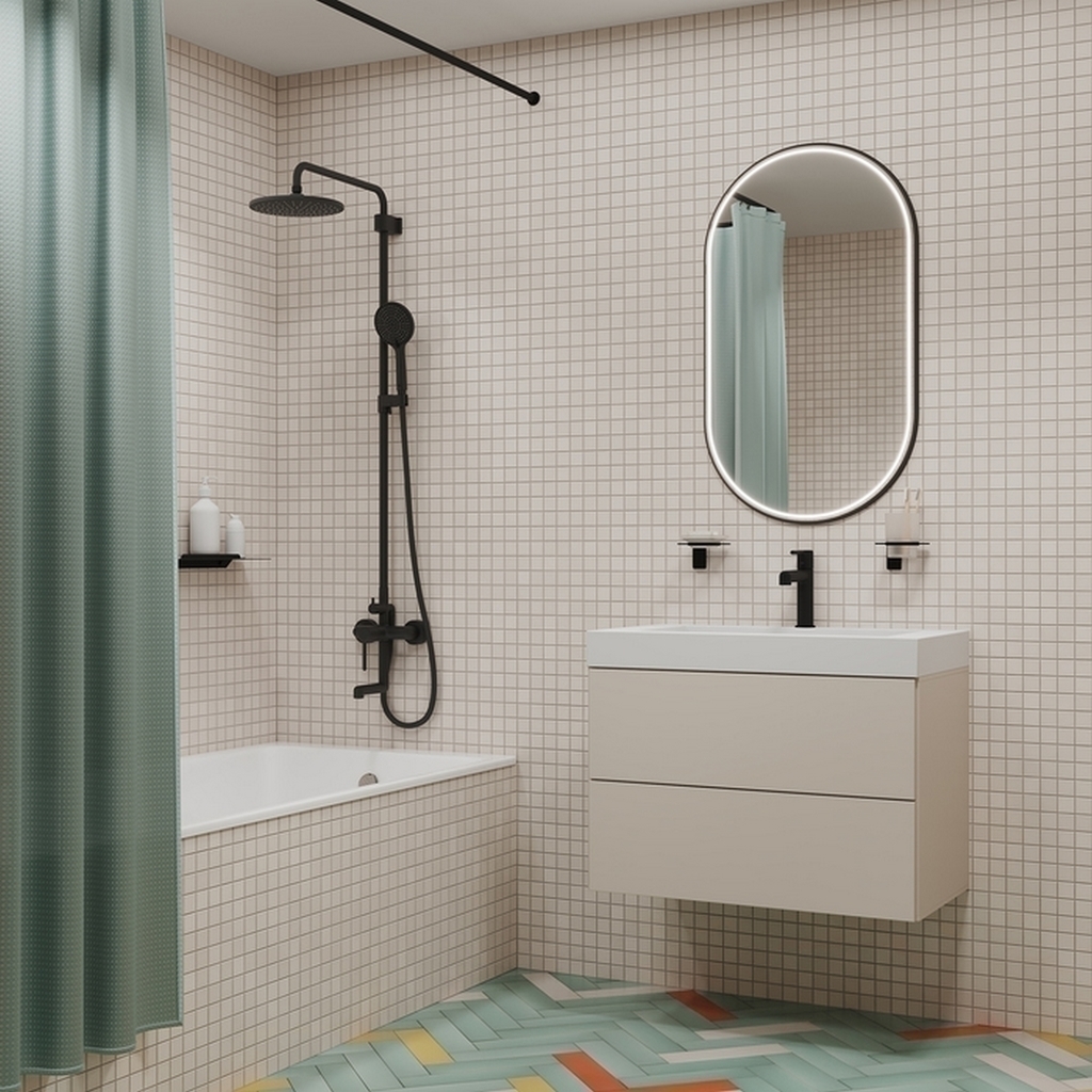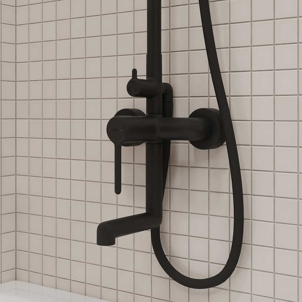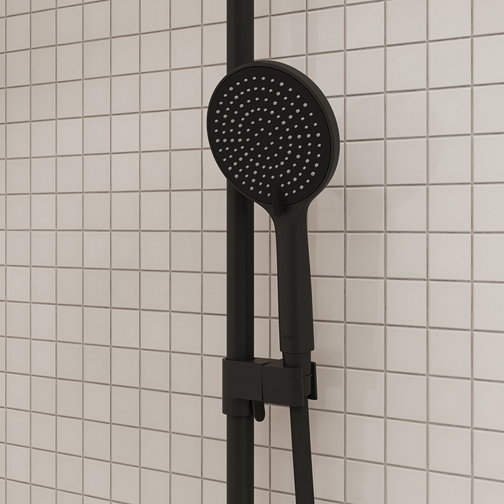 Стильная функциональная душевая система Aiger, где удачно сочетается актуальный современный дизайн и востребованный черный матовый цвет. Тонкая удлиненная ручка добавляет смесителю изящества и комфорт в управлении.Штанга верхнего душа с регулируемой высотой 860-1360 мм позволяет с комфортом принимать душ всей семье.