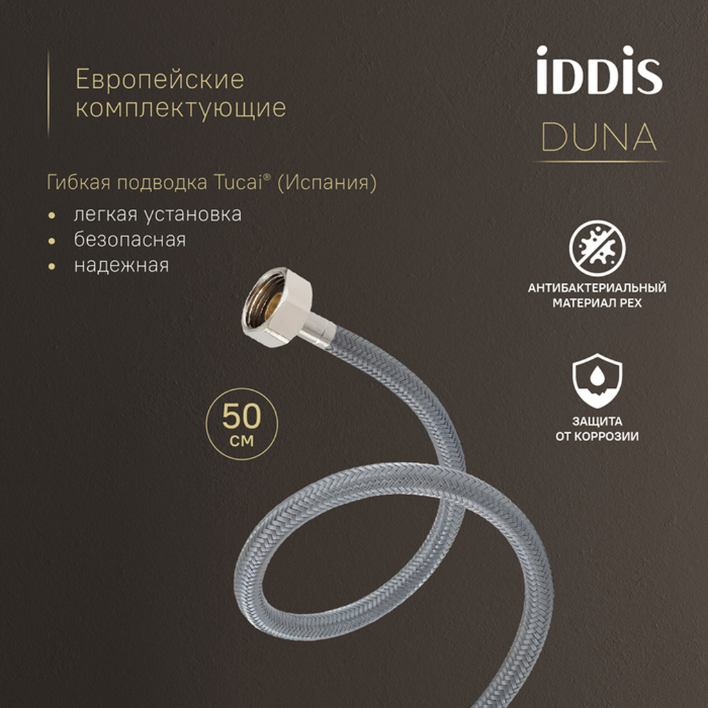 Смеситель для умывальника Duna – воплощение актуальных трендов в дизайне смесителей в безупречном исполнении: фрезеровка, изысканная ручка-петля, модные цвета и фактуры. Ручка выполнена из латуни для сохранения чёткости линий фрезеровки. Европейские комплектующие и технологии — для премиального качества. — Скрытый аэратор Neoperl® (Швейцария) не нарушает дизайн, формирует ровный поток и снижает расход воды. Ключ для обслуживания в комплекте. — Керамический картридж с металлическим штоком Сitec® (Испания) обеспечивает долговечность, точность регулировки и плавный ход ручки. — Гибкая подводка Tucai® (Испания): безопасна для здоровья благодаря шлангу из нетоксичного материала PEX с антибактериальным эффектом, нейлоновая оплетка для защиты от коррозии и износа, увеличенная длина 50 см упрощает монтаж. Простая надёжная установка: металлическая гайка с тремя винтами — стабильность без люфта даже на неровной поверхности. Максимум тишины при работе: благодаря корпусу из нержавеющей стали работает практически бесшумно. Повышенная стойкость к бытовой химии и механическим повреждениям благодаря надёжному PVD-покрытию. Гарантия на смесители IDDIS® – 10 лет.Сертификаты, декларации и паспорта товаров TIM