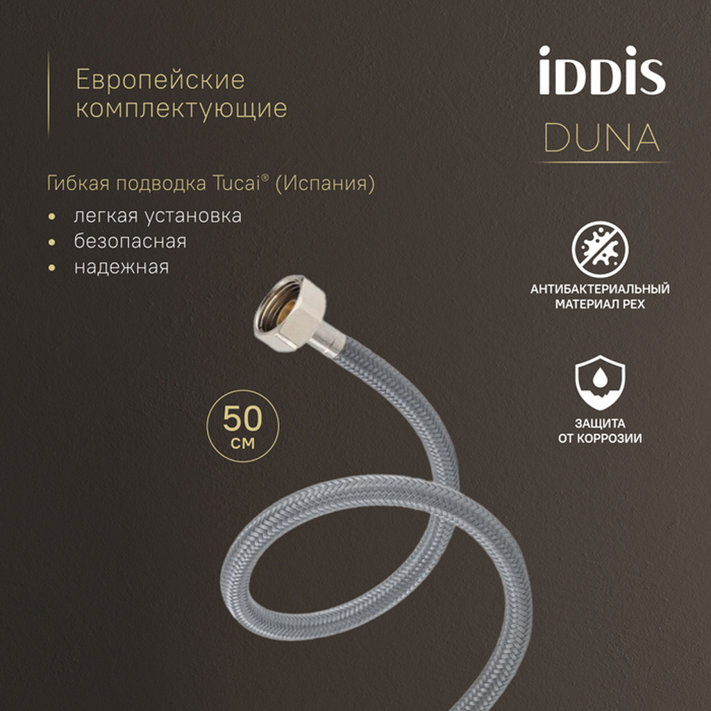 Смеситель для умывальника Duna – воплощение актуальных трендов в дизайне смесителей в безупречном исполнении: фрезеровка, изысканная ручка-петля, модные цвета и фактуры. Ручка выполнена из латуни для сохранения чёткости линий фрезеровки. Европейские комплектующие и технологии — для премиального качества. — Скрытый аэратор Neoperl® (Швейцария) не нарушает дизайн, формирует ровный поток и снижает расход воды. Ключ для обслуживания в комплекте. — Керамический картридж с металлическим штоком Сitec® (Испания) обеспечивает долговечность, точность регулировки и плавный ход ручки. — Гибкая подводка Tucai® (Испания): безопасна для здоровья благодаря шлангу из нетоксичного материала PEX с антибактериальным эффектом, нейлоновая оплетка для защиты от коррозии и износа, увеличенная длина 50 см упрощает монтаж. Простая надёжная установка: металлическая гайка с тремя винтами — стабильность без люфта даже на неровной поверхности. Максимум тишины при работе: благодаря корпусу из нержавеющей стали работает практически бесшумно. Хромированное покрытие устойчиво к потускнению (при должном уходе). Duna – там, где функциональность встречается с красотой. Гарантия на смесители IDDIS® – 10 лет.Сертификаты, декларации и паспорта товаров TIM