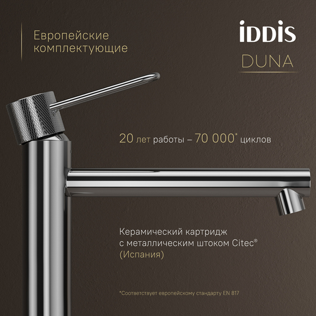 Смеситель для настольного умывальника Duna – воплощение актуальных трендов в дизайне смесителей в безупречном исполнении: фрезеровка, изысканная ручка-петля, модные цвета и фактуры. Ручка выполнена из латуни для сохранения чёткости линий фрезеровки. Европейские комплектующие и технологии — для премиального качества: — Скрытый аэратор Neoperl® (Швейцария) не нарушает дизайн, формирует ровный поток и снижает расход воды. Ключ для обслуживания в комплекте. — Керамический картридж с металлическим штоком Сitec® (Испания) обеспечивает долговечность, точность регулировки и плавный ход ручки. — Гибкая подводка Tucai® (Испания): безопасна для здоровья благодаря шлангу из нетоксичного материала PEX с антибактериальным эффектом, нейлоновая оплетка для защиты от коррозии и износа, увеличенная длина 50 см упрощает монтаж. Простая надёжная установка: металлическая гайка с тремя винтами — стабильность без люфта даже на неровной поверхности. Максимум тишины при работе: благодаря корпусу из нержавеющей стали работает практически бесшумно. Хромированное покрытие устойчиво к потускнению (при должном уходе). Duna – там, где функциональность встречается с красотой. Гарантия на смесители IDDIS® – 10 лет.Сертификаты, декларации и паспорта товаров TIM
