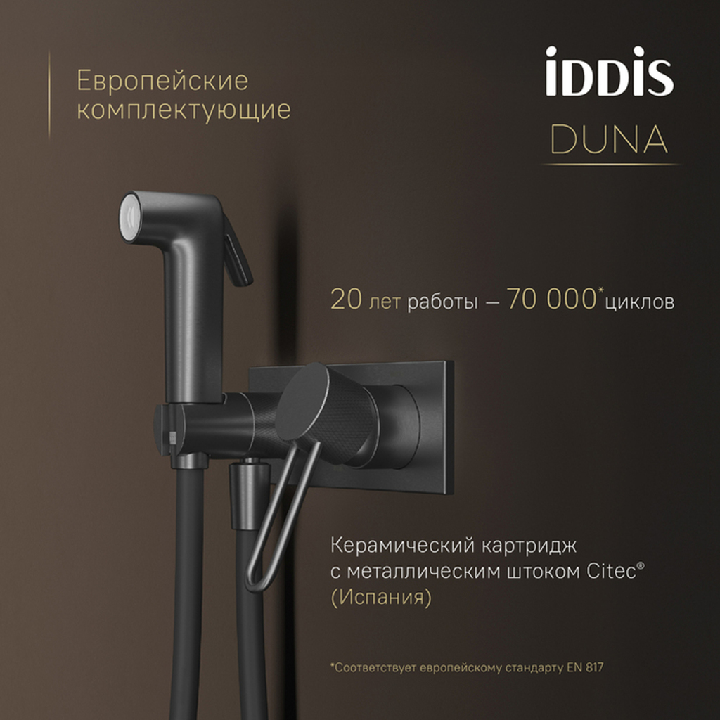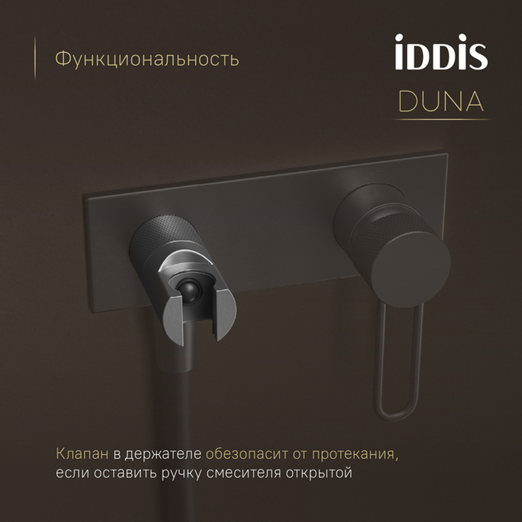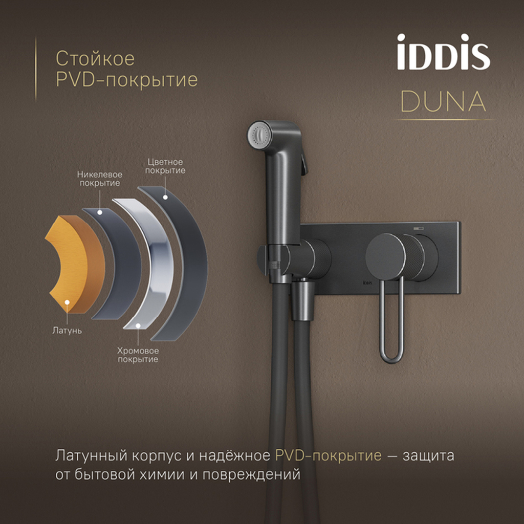 Смеситель с гигиеническим душем Duna – воплощение актуальных трендов в дизайне смесителей в безупречном исполнении: фрезеровка, изысканная ручка-петля, модные цвета и фактуры. Ручка выполнена из латуни для сохранения чёткости линий фрезеровки. Безопасность и удобство — по умолчанию: автоматический клапан в держателе перекрывает воду при установке лейки — даже если картридж открыт, а защита от избыточного давления предотвращает накопление воды и риск разрыва лейки. Компактная лейка включается нажатием на рычажок. Гибкий и надёжный силиконовый шланг 1,2 м. Эстетичная цельная латунная панель: чёткие грани и плотное прилегание к стене. Просто ухаживать – лицевая часть легко снимается монетой для очистки. Повышенная стойкость к бытовой химии и механическим повреждениям благодаря надёжному PVD-покрытию. Duna – там, где функциональность встречается с красотой.Гарантия на смесители IDDIS® – 10 лет, на душевые аксессуары – 3 года.
