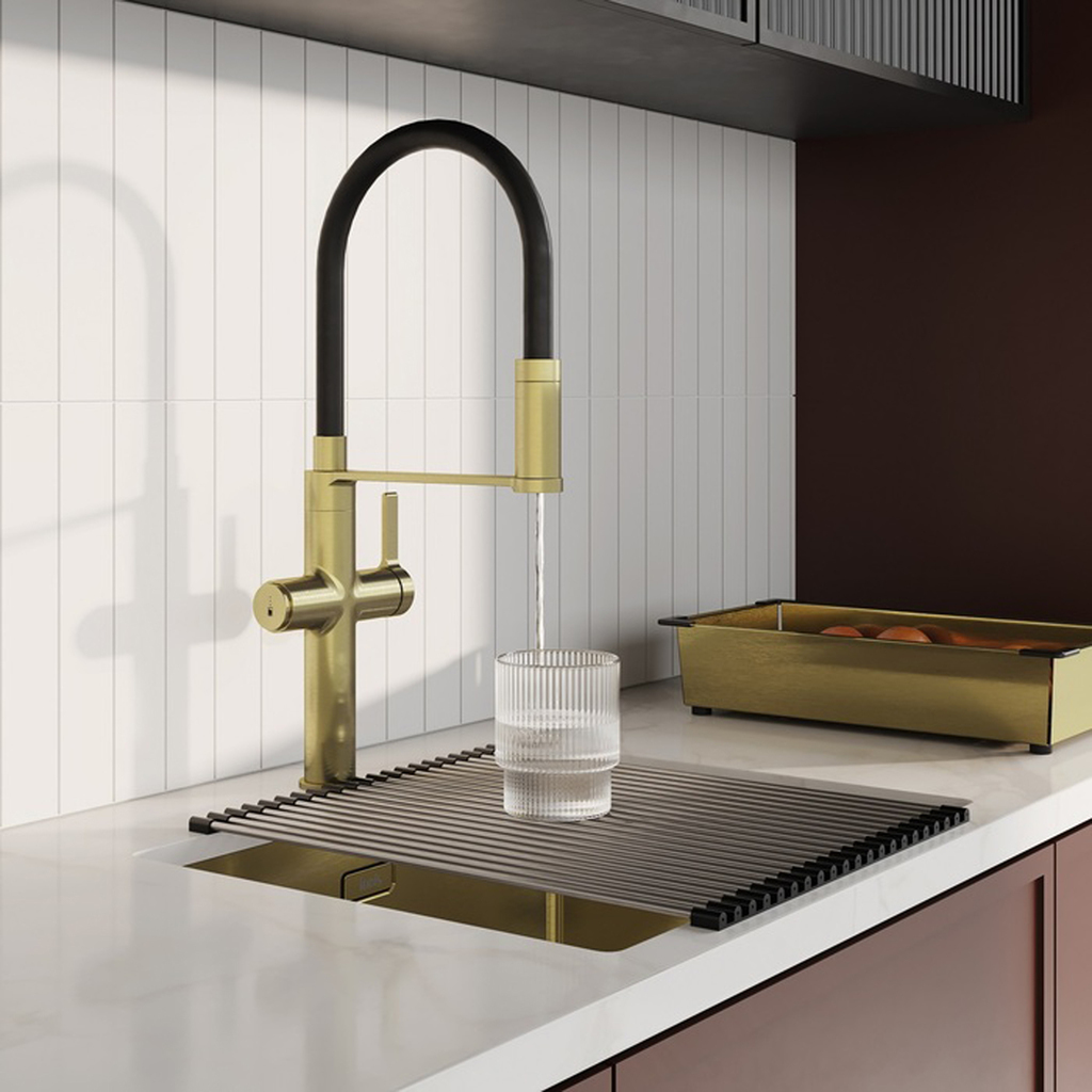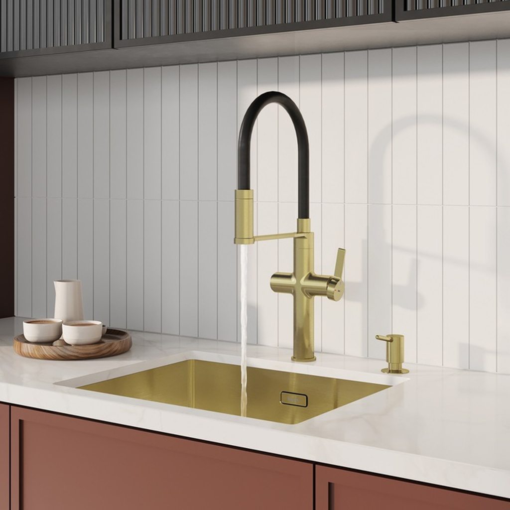 Профессиональный смеситель для кухни Ikon в матовом золоте с чёрным гибким изливом и отдельным каналом для фильтрованной воды. Современный, продуманный и функциональный, он успешно справляется с повседневными задачами на кухне. Гибкий излив позволяет направить струю воды в нужную точку. Излив фиксируется магнитным замком за одну секунду.Встроенный канал для фильтрованной воды – можно наслаждаться чистой питьевой водой прямо из-под крана. Удобно переключение одним нажатием кнопки. Фильтр в комплекте не идёт и приобретается отдельно.