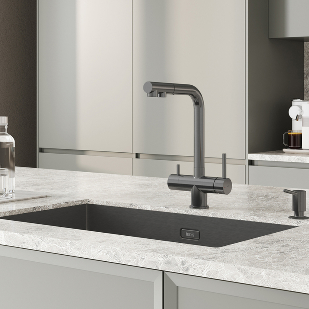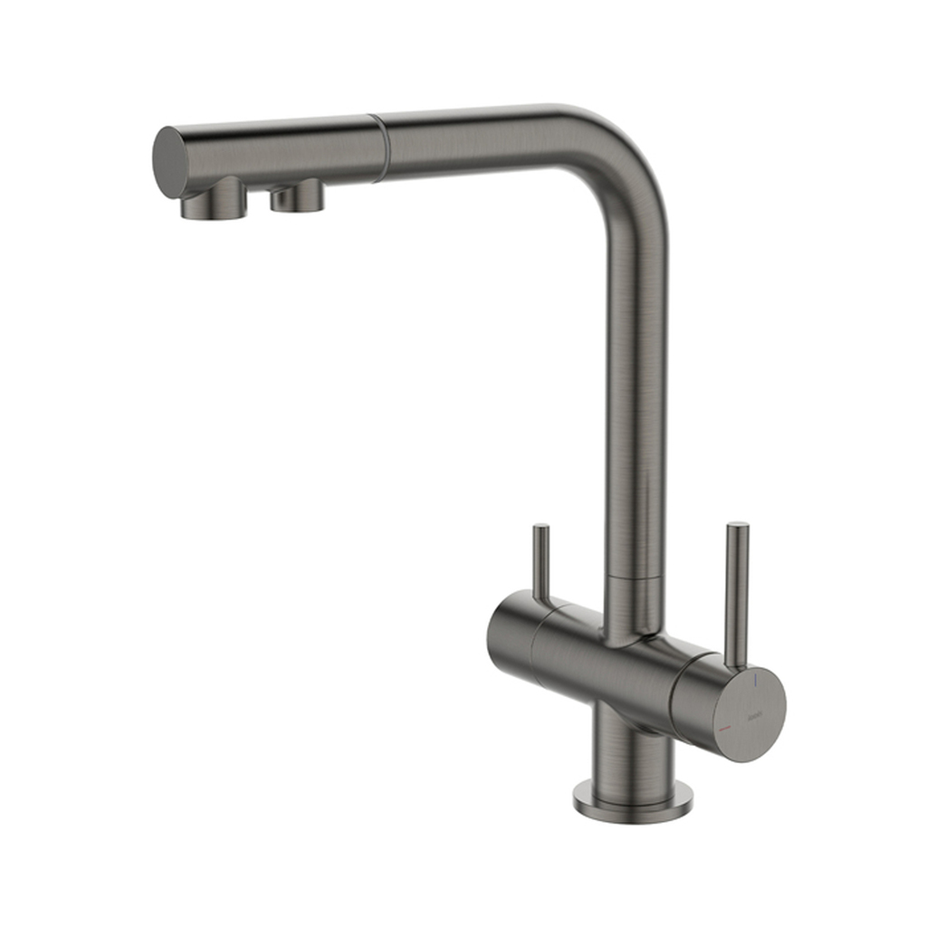 Смеситель Umbra в цвете графит – стильный дизайн и многофункциональность, необходимая на современной кухне. Удобная эргономичная ручка, питьевая вода из отдельного встроенного канала для фильтрованной воды и выдвижной излив – детали, которые сделают ежедневные хлопоты приятными.Удобное управление водопроводной и фильтрованной водой с помощью двух отдельных ручек.