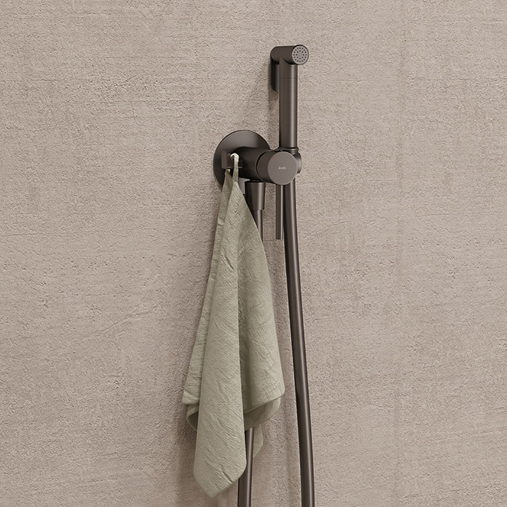 Встраиваемый смеситель с гигиеническим душем Axes – практичный и стильный, его дизайн сочетает в себе трендовый минимализм форм и четкие грани. Имеет крючок для полотенца, который можно установить как слева, так и справа. Гладкий душевой шланг 1,2 м в комплекте.Гигиеническая лейка очень компактная, но при этом она комфортно и уверенно ощущается в любой руке – благодаря тому, что изготовлена из увесистой латуни. Экономит пространство и упрощает уборку — благодаря скрытому монтажу в стену (на глубину 40–60 мм) и отсутствию больших выступающих элементов конструкции.