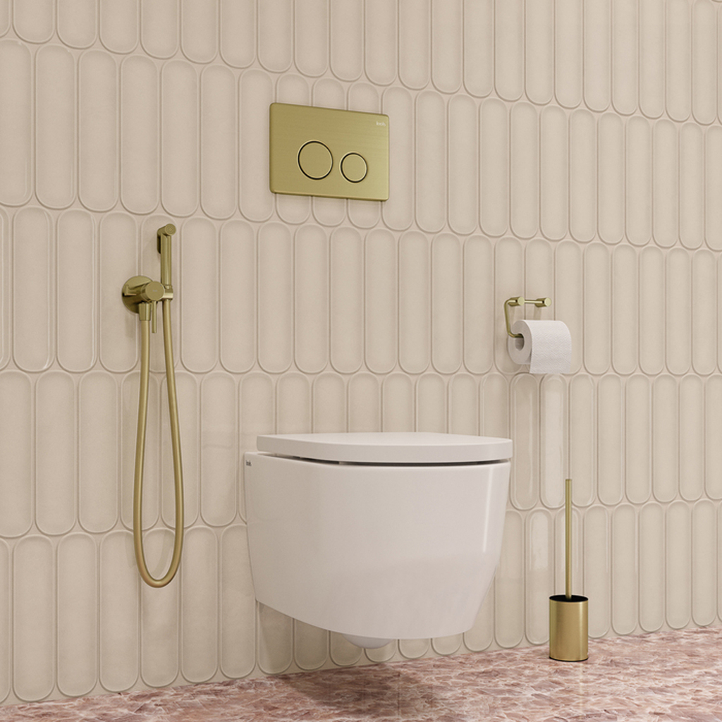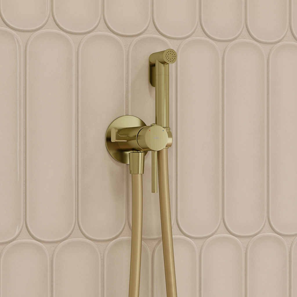 Встраиваемый смеситель с гигиеническим душем Axes в красивом оттенке матового золота – практичный и стильный, его дизайн сочетает в себе трендовый минимализм форм и четкие грани. Имеет крючок для полотенца, который можно установить как слева, так и справа. Гладкий душевой шланг 1,2 м в комплекте. Гигиеническая лейка очень компактная, но при этом она комфортно и уверенно ощущается в любой руке – благодаря тому, что изготовлена из увесистой латуни. Экономит пространство и упрощает уборку — благодаря скрытому монтажу в стену (на глубину 40–60 мм) и отсутствию больших выступающих элементов конструкции. Подключается с помощью любых труб, диаметр входных отверстий ? дюйма. Смеситель прослужит долго благодаря надежному корпусу из прочной латуни, стойкому к коррозии, резким изменениям давления и перепадам температуры воды. Плавный ход ручки и абсолютная точность регулировки температуры и напора воды — за счет качественного керамического картриджа Softap. Гарантия на смесители IDDIS® – 10 лет, на лейку и шланг – 3 года.Сертификаты, декларации и паспорта товаров TIM