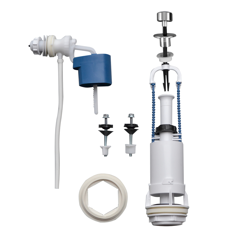 Комплекты арматуры с кнопочным одноуровневым/двухуровневым клапаном выпуска предназначены для использования с керамическими бачками, отверстие в крышке которых имеет примерный диаметр 40 мм. Комплекты с двухуровневым клапаном обеспечивают экономное расходование воды.