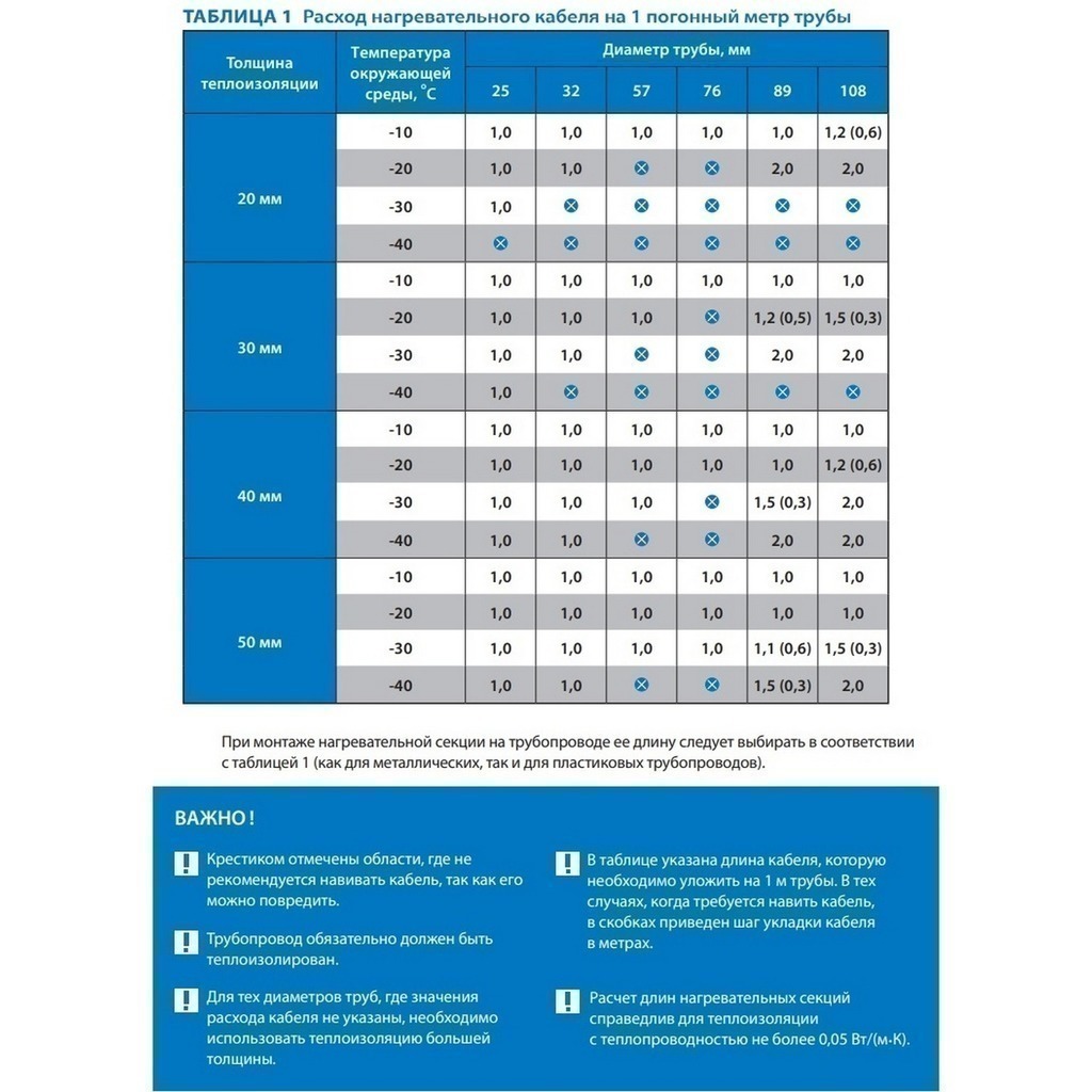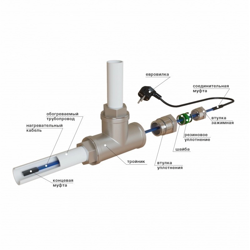 Электропитание осуществляется от сети напряжением 220-240 В, подводится с одного конца. В конце участка обогрева установлена концевая муфта, размещаемая внутри трубы и обеспечивающая защиту IP68. Для ввода в трубу используется специальный cальниковый узел, состоящий из двух втулок, двух шайб и резинового уплотнения.