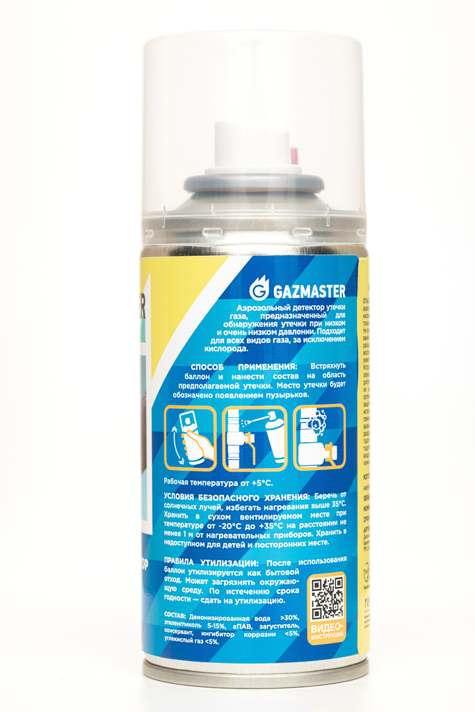Аэрозольный детектор утечек газа GAZMASTER - продукт специально выпущенный для проверки герметичности любого газового и воздушного соединения.Недостаточно уплотненное место обнаруживает себя появлением пузырьков воздуха. Они возникают в специально подобранном составе аэрозоля даже при низком давлении, подобно мыльной пене.