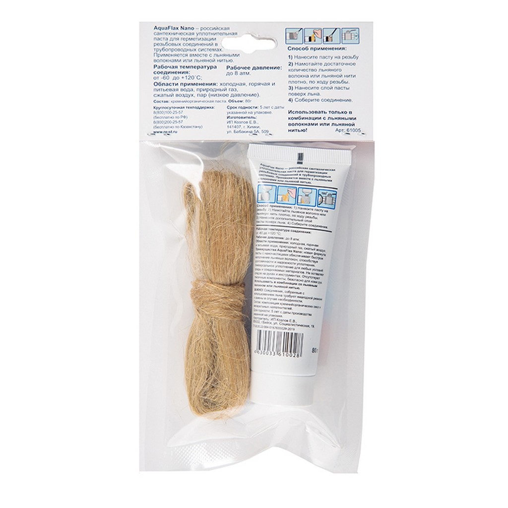 Рекомендуется применять в комбинации с уплотнительной пастой для льна AquaFlax Nano. ВАЖНО! Соединения, собранные с использованием льна требуют ежегодной ревизии и замены в случае необходимости.
