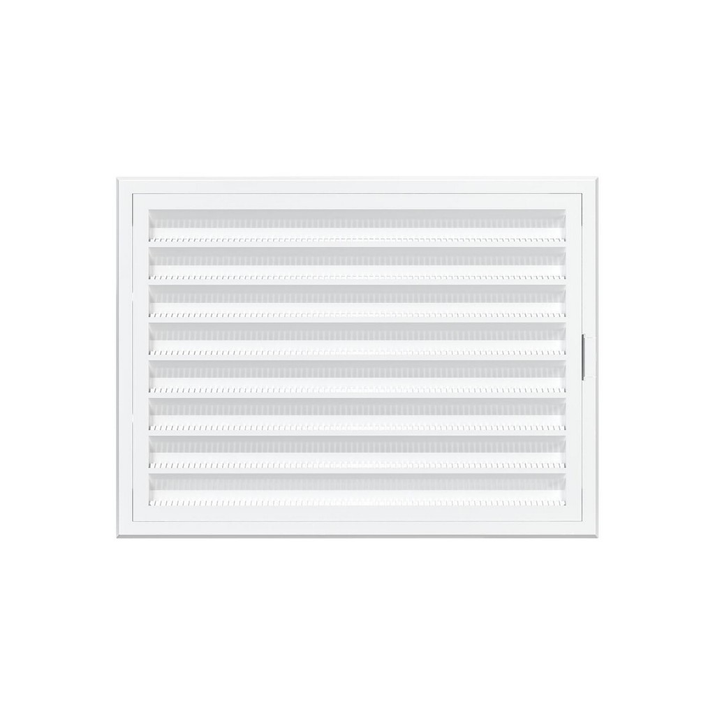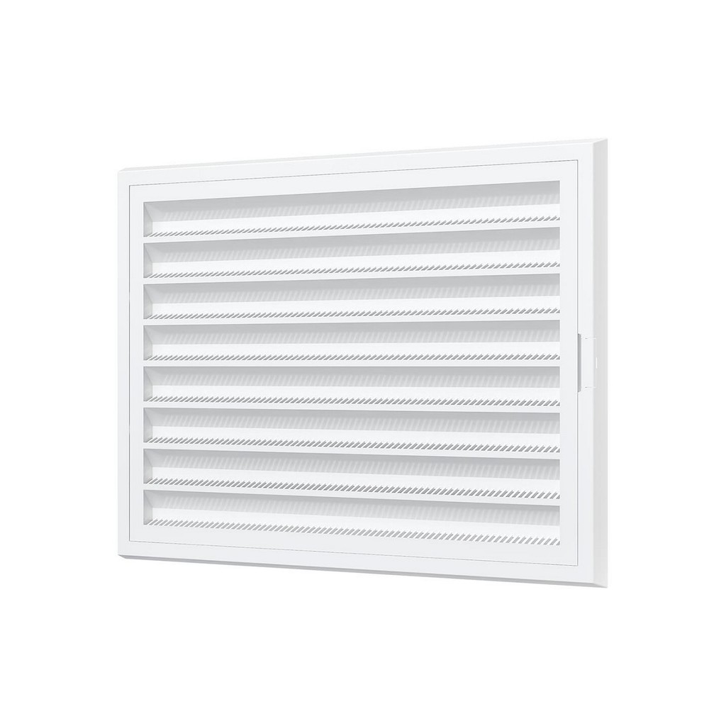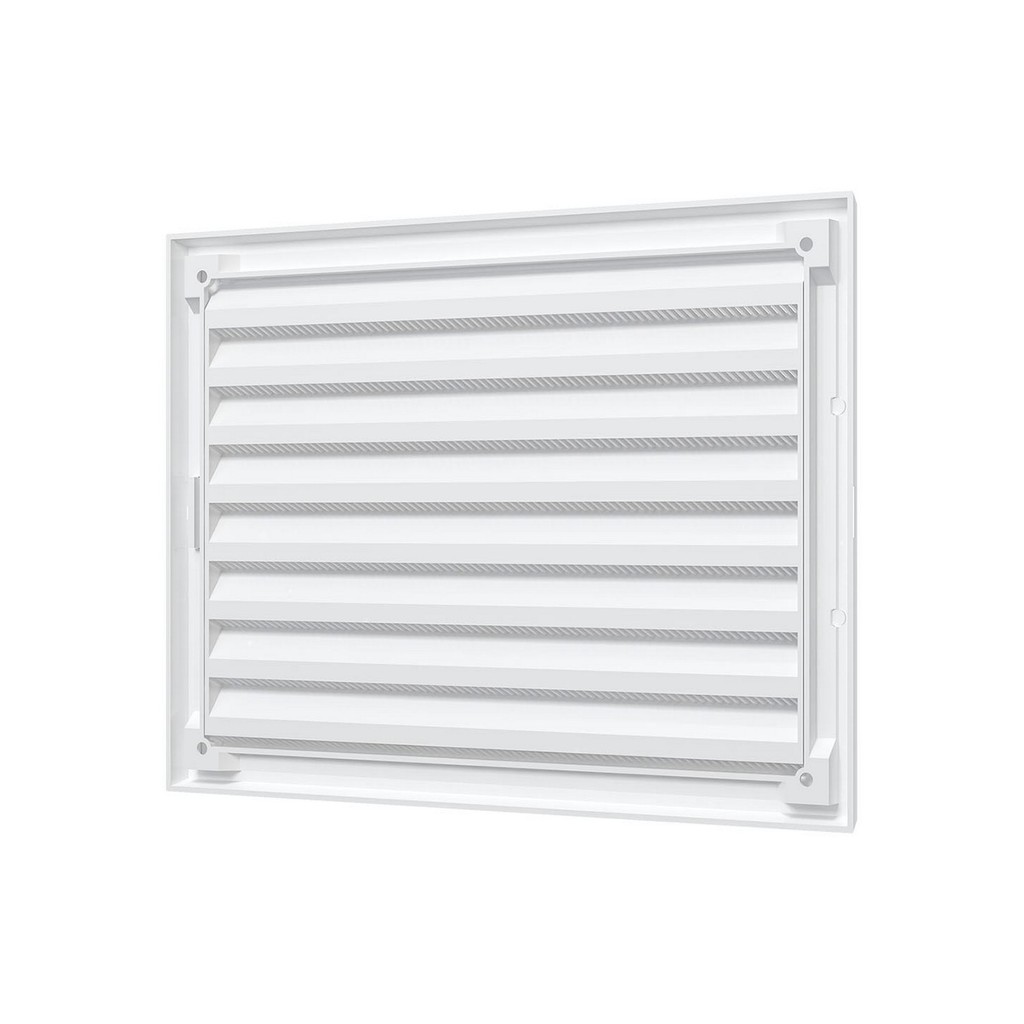 Вентиляционная решетка имеет наклонные жалюзи и оснащена защитной сеткой от насекомых.