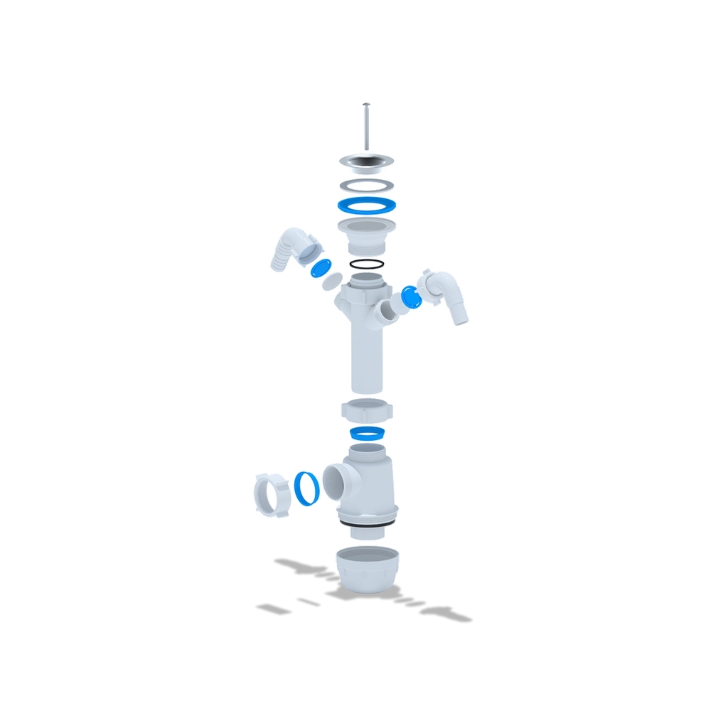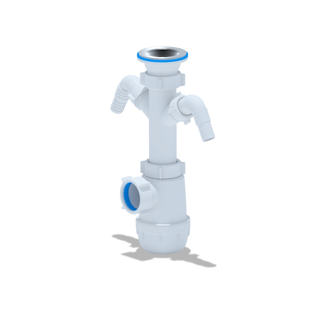 Сифон для кухонных моек с диаметром сливного отверстия 50мм, бутылочного типа с увеличенным корпусом, с разборным выпуском и нержавеющей решеткой, с двумя отводами для подключения бытовой техники. Выход для подключения к канализации 40мм.Форма сифона позволяет поддерживать хорошую пропускную способность слива сточной воды, выполняя свою главную функцию - формирование гидрозатвора для отсечения неприятных запахов из канализации.