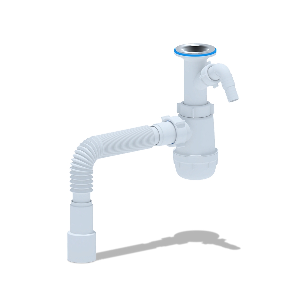Сифон для кухонной мойки с диаметром сливного отверстия 50мм, бутылочного типа с увеличенным корпусом, с литым выпуском и нержавеющей решеткой. С отводом для стиральной машины, для подключения к канализации комплектуется гибкой трубой 40*40/50мм.Форма сифона позволяет поддерживать хорошую пропускную способность слива сточной воды, выполняя свою главную функцию - формирование гидрозатвора для отсечения неприятных запахов из канализации.