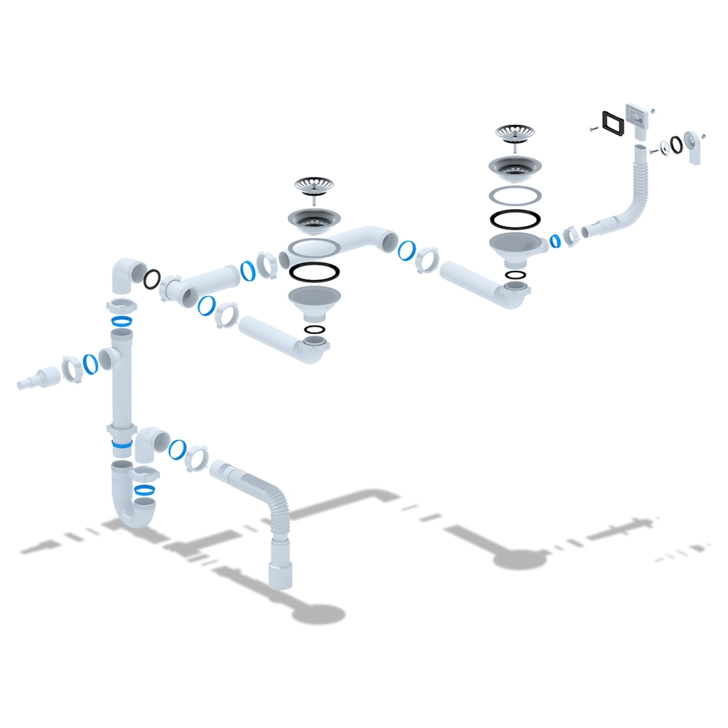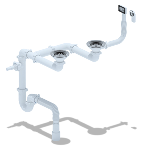 Сифон подходит для любой кухонной мойки с двумя чашами как из нержавеющей стали, так и из композитных материалов. Прокладка прямоугольного перелива так же является универсальной и позволяет устанавливать перелив на мойки круглой и прямоугольной формы. Для этого необходимо перевернуть прокладку и вставить в посадочное место корпуса перелива нужной стороной. Широкий диапазон регулировок позволяет не задумываться о расположении сливных отверстий в чашах мойки и легко произвести монтаж изделия. Для удобства эксплуатации сифон выполнен со смещением к стене, что позволяет экономить пространство под мойкой.Сифон укомплектован отводом для подключения бытовой техники и гофрированной трубой 40х40/50.