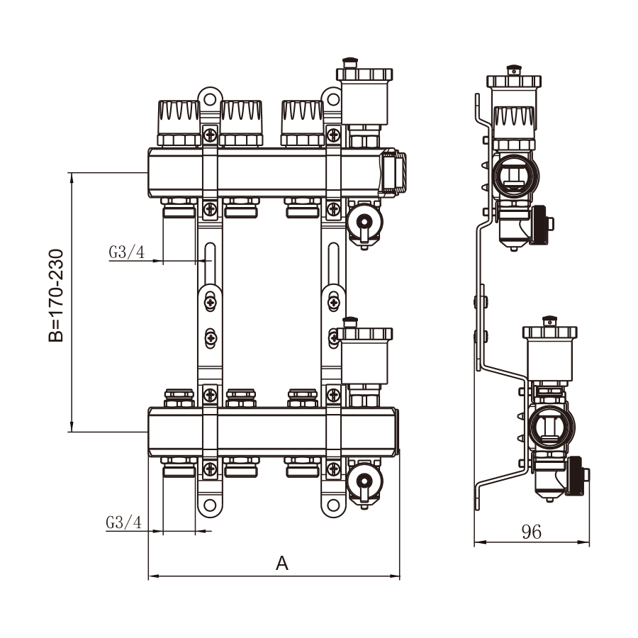 - Подробная комплектация напорный коллектор с запорными вентилями - 1 шт., обратный коллектор с термостатическими вентилями - 1 шт., дренажные клапаны - 2 шт., цельнометаллический кронштейн - 2 шт., заглушки - 2 шт.