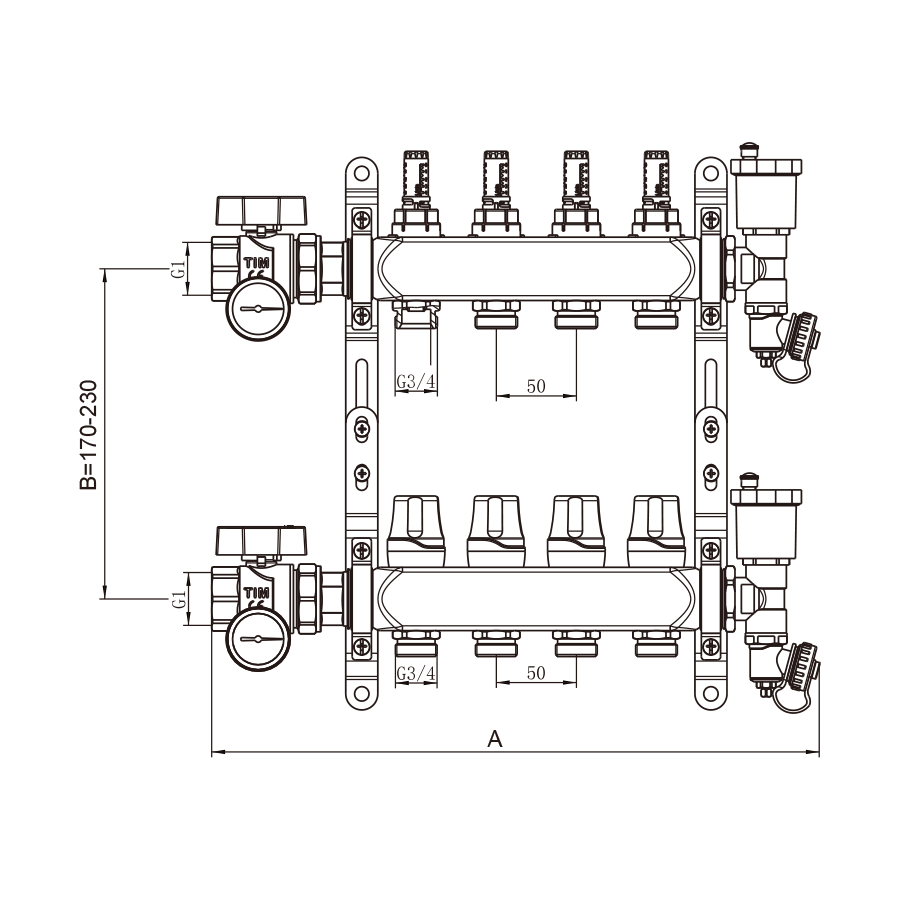 Выходы от 3 до 12 с соединением 3/4” Евроконус. Межосевое расстояние: 50мм.