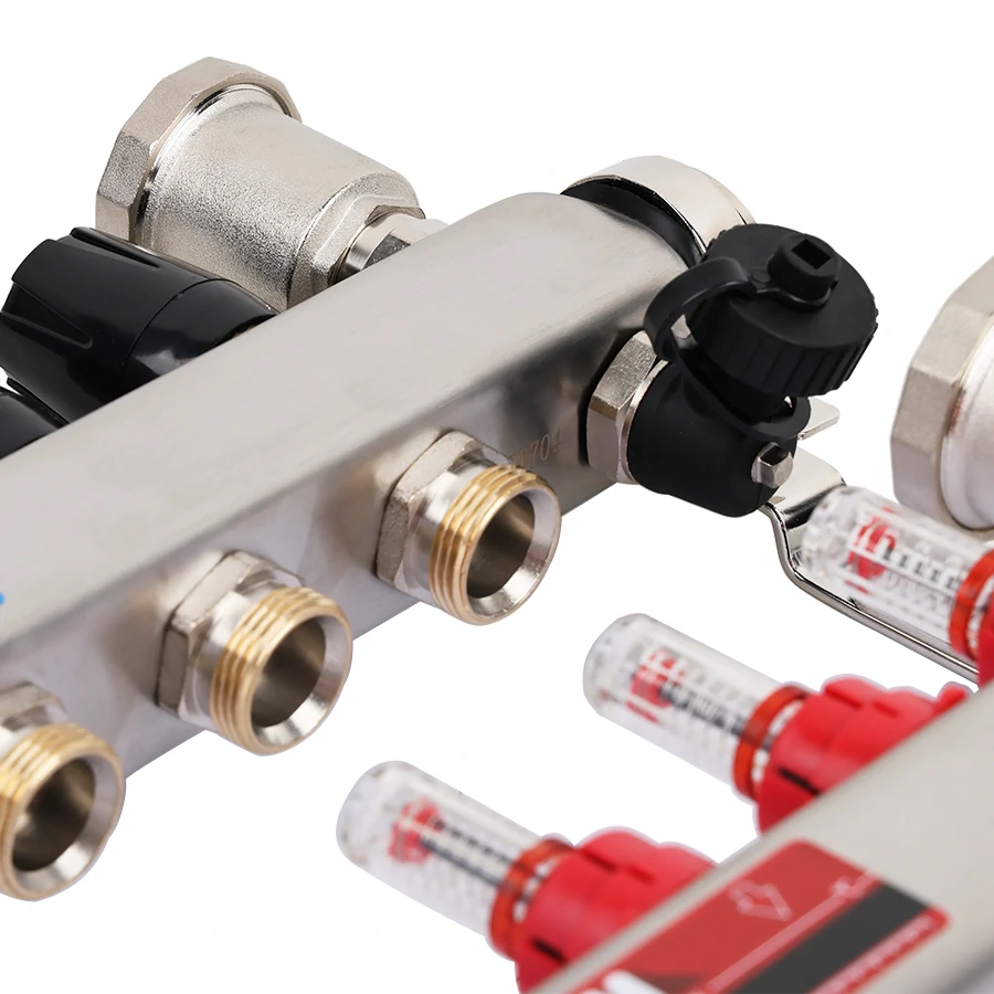 Коллекторная группа с расходомерами и термостатическими клапанами с регулировочными ручками, с дренажными клапанами и воздухоотводчиками