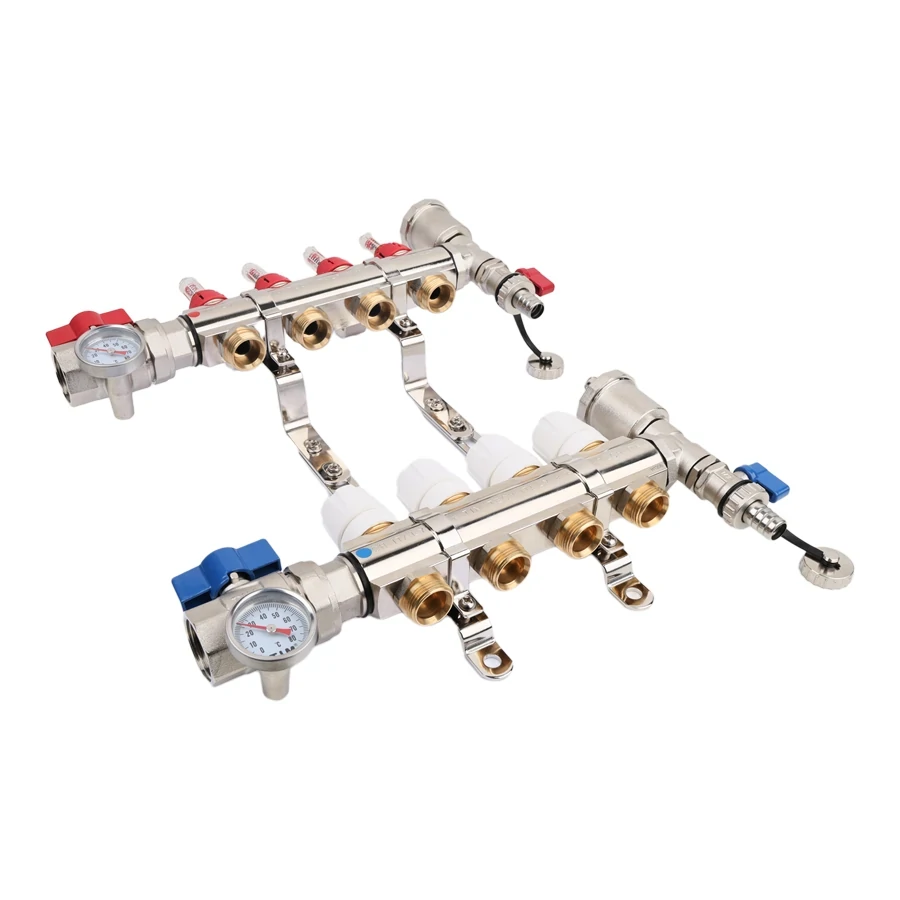 - Подробная комплектация напорный коллектор с запорными вентилями - 1 шт., обратный коллектор с термостатическими вентилями - 1 шт., дренажные клапаны - 2 шт., цельнометаллический кронштейн - 2 шт., заглушки - 2 шт.