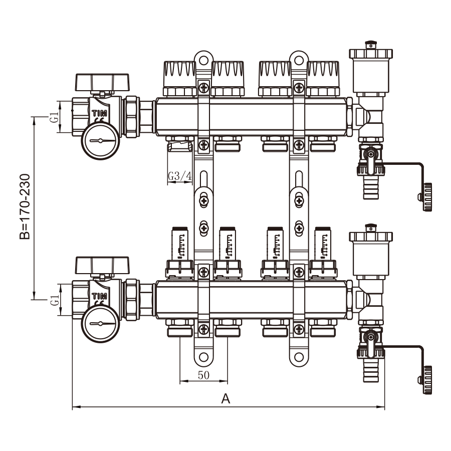 Выходы от 3 до 12 с соединением 3/4” Евроконус. Межосевое расстояние: 50мм.