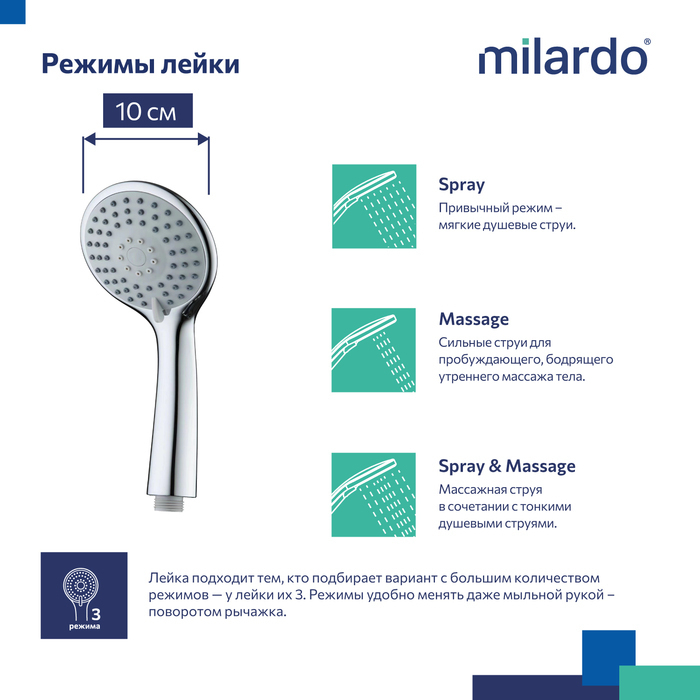 Лейка для душа Milardo 3803F10M18 D76мм, 3 режима хром, пакет