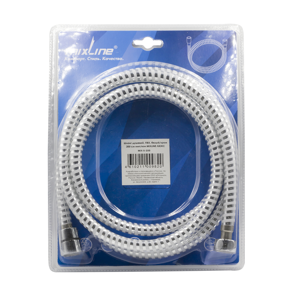 Шланг душевой 200 см имп/кон, ПВХ, белый/хром MIXLINE MIX-5-200 ЛЮКС (блистер)