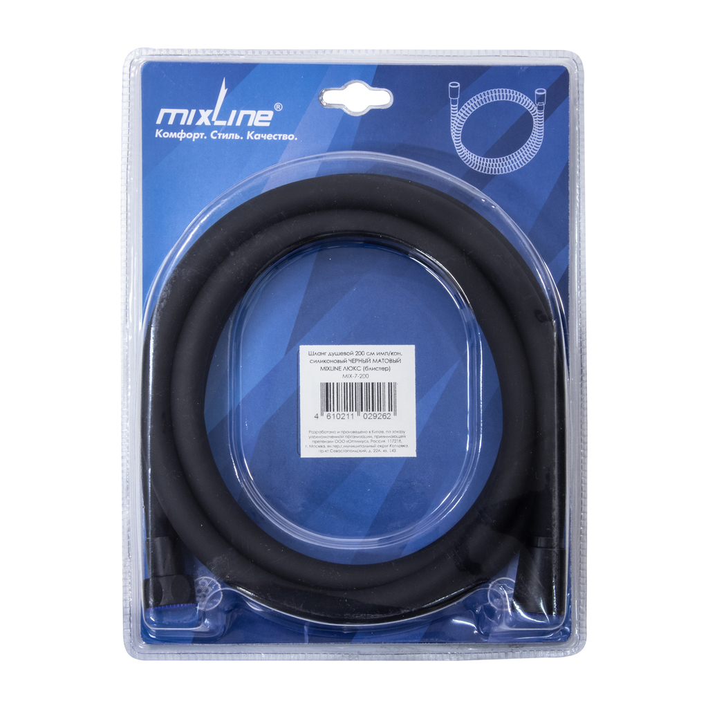 Шланг душевой 200 см имп/кон, силиконовый ЧЕРНЫЙ МАТОВЫЙ MIXLINE MIX-7-200 ЛЮКС (блистер)